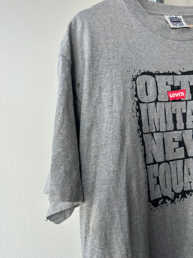 A classic 1990s Levi´s graphic tee, carrying a bold "Often Imitated, Never Equalled" slogan front and center.Grey base, heavy cotton feel, featuring a perfectly cracked print and Levi’s small red tag stitched into the design — subtle but sharp.A straightforward piece with authentic wear from time and washes, giving it that true vintage edge without trying too hard.