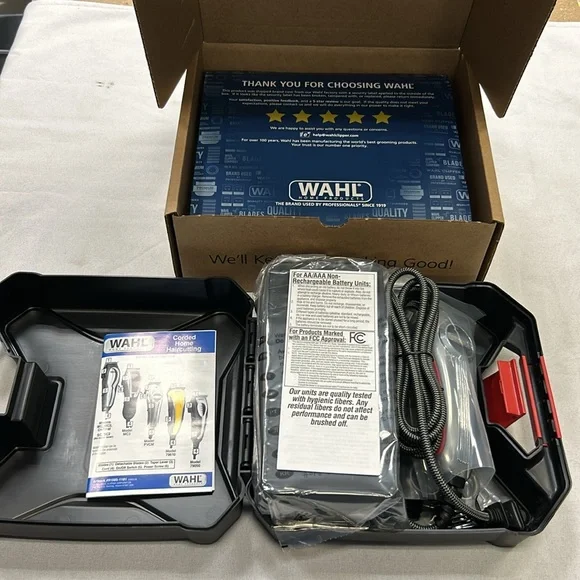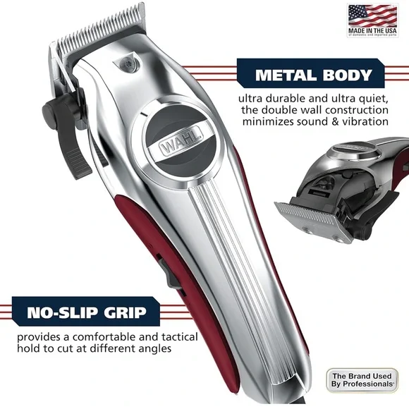 NIB! Wahl Pro Series All Metal Ecom Clipper Kit New in Box Metal Housing – The durable metal housing is double insulated which means it’s ultra-quiet while hair cutting, double insulation also allows for cooler operating temperatures during usePremium Storage Case – Hard storage case is a deep black with a red clip to keep everything in place; Bonus storage caddy is included that conveniently stores all your new guide combsMade in the USA – Made right here in the United States of America, we guarantee the quality construction and craftsmanship of our work, this clipper comes with a limited lifetime warranty for worry-free operationBraided Power Cable – The included power cable is braided which means it has increased durability and aesthetics, the extra-long length allows for more room to move around when haircutting at homePremium Haircutting Guards – Complete set of 12 with stainless steel clips included; Secure-Snap attachment guards range in size from 1/16” to 1” (Included Sizes 0.5, 1, 1.5, 2, 3, 4, 5, 6, 7, 8, L, R)Haircutting Tools – The Metal hair clipping kit features a premium storage caddy for guards and accessories, a styling comb, hair scissors, clipper oil, hard storage case, and more