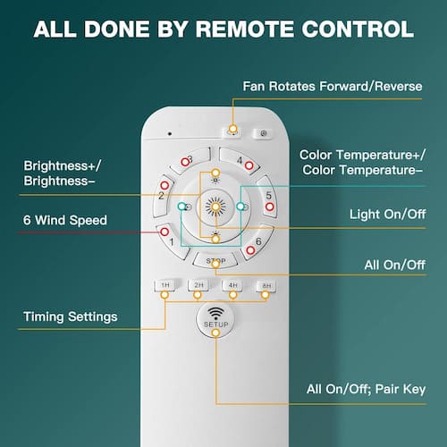 About This Product:Select this multi-functional modern ceiling Fan. 6 wind speeds and 4 timer functions (1-hour to 2-hour to 4-hour to 8-hour) can be freely adjusted for ideal comfort. The ceiling fan light fixture has infinitely adjustable brightness (from 10% to 100%) and 3 color temperature controls, from warm white (3000K) to natural light (4500K) to cool white (6500K), to meet your different lighting needs. The ceiling fan has a modern design, simple and generous, perfect for bedroom, dining room, kitchen, children´s room, study, small living room, gym, garage ect.