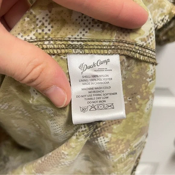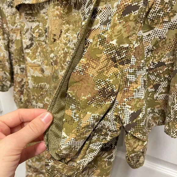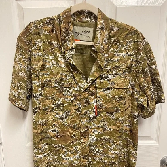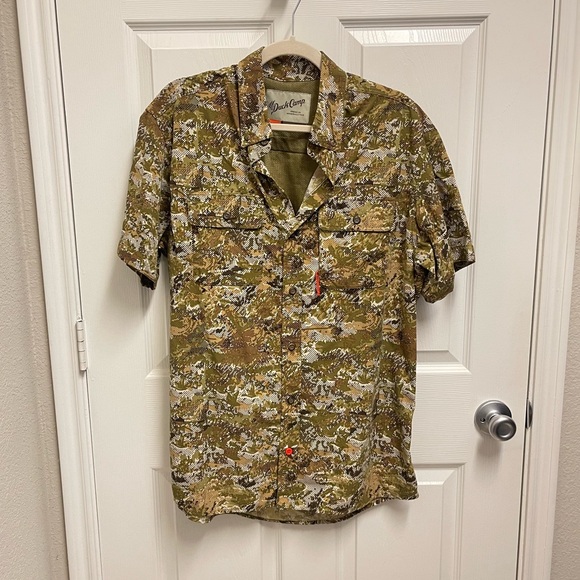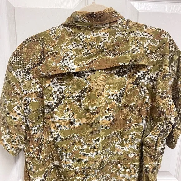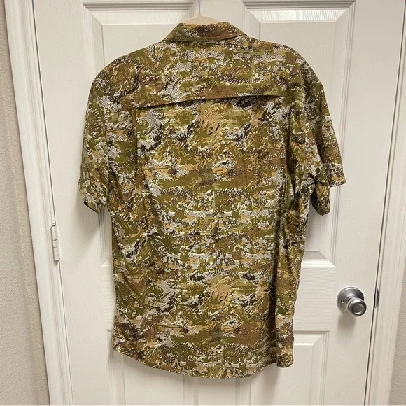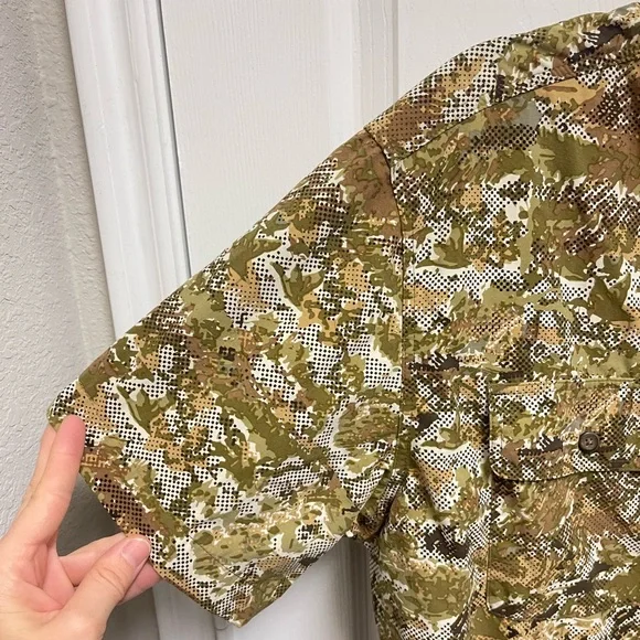 Large. White green and brown camo pattern short sleeve button down shirt. Mesh venting at back. Fishing shirt. Chest fold over button pockets. In great condition.