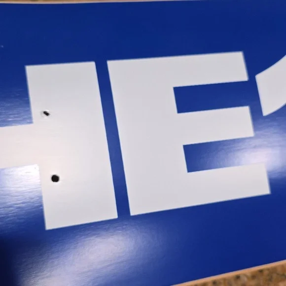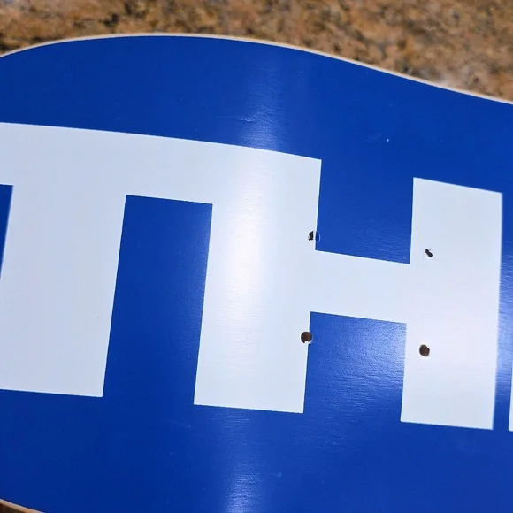 A Logo Skate Deck by The 1975.. this was never hung nor used.. please view all pictures for flaws as this arrived this way.. the line in the middle of the 9,7, and 5 is noticeable..
