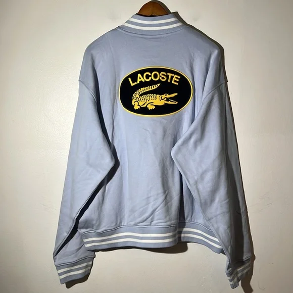 NWT Engraved snap buttons and the iconic embroidered crocodile logo make this brushed fleece varsity bomber jacket a captivating, classic look from collar to hem. Imported Round collar Snap closure Long sleeves Side pockets Logo at left chest Size & FitRegular fit Materials & CareCotton/polyester; rib: cotton/elastane Machine washable