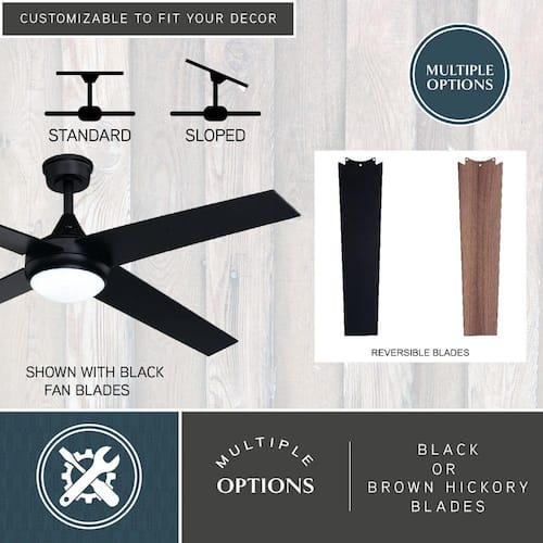 About This Product:Introducing the Hamlin 52-in. ceiling fan: a modern interpretation of rustic windmill design, perfect for transitional and contemporary interiors. Featuring reversible blades in black or brown hickory that complement a sleek black motor housing, this fan adds style and functionality to any indoor space. With integrated LED lighting, three-speed fan control, and remote dimming capabilities, the Hamlin offers both ambiance and comfort. Backed by safety certifications and a lifetime limited warranty for peace of mind.