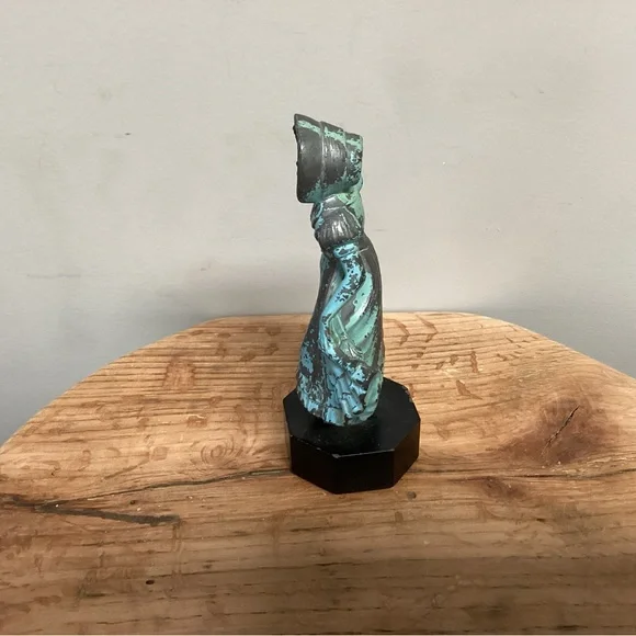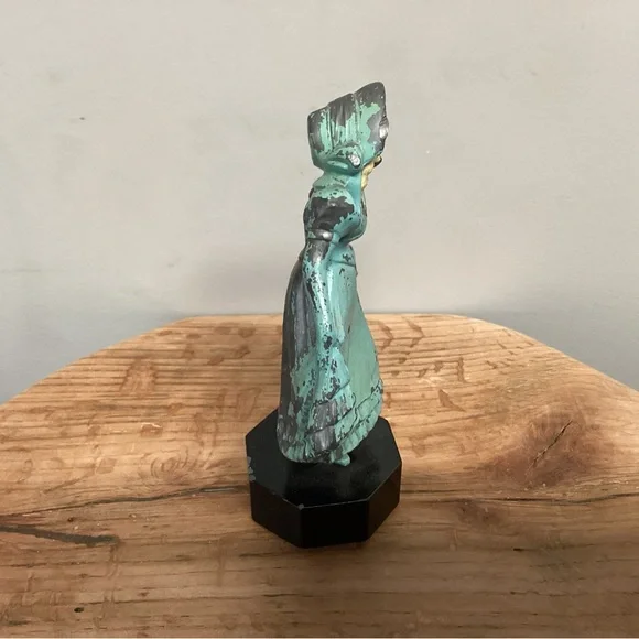 This is a very old vintage piece, probably from the 1930’s or 1940’s, by J. B. Hirsch during the Art-Deco era.It’s a metal alloy figurine, probably made with a French Bronze for the Lady herself with the exception of her Face which may be an Ivorine, a celluiold material, both appear to be a heavy metal material.Her base is a metal or marble type material as well.The small velvet type material on the base bottom does peel back a little so I did take a picture of that as well, a small dap of glue would solve this issue.Overall the statue is in very good and solid condition with only some of the surface paint having come off which is very typical for something that’s been around for 80 to 90 years now.It has a heavy feel and look to it as you would see on a Pewter crafted piece, very solid indeed.Add this piece of art work to your collection today.Please see all photos attached for all the details, size, weight and condition of this highly rare and collectible piece of art work which could easily become a true antique piece over the next 5 to 10 years. Tags: Vintage J B Hirsch Statue French Bronze Pewter Copper Metal Brass Metals Alloys Lady Green White Black Old Rare Collectible Shabby Chic Boho Bohemian Farmhouse Home Office Bar Work Marble Art Deco Victorian Girl Lady Women Wedding Bridal