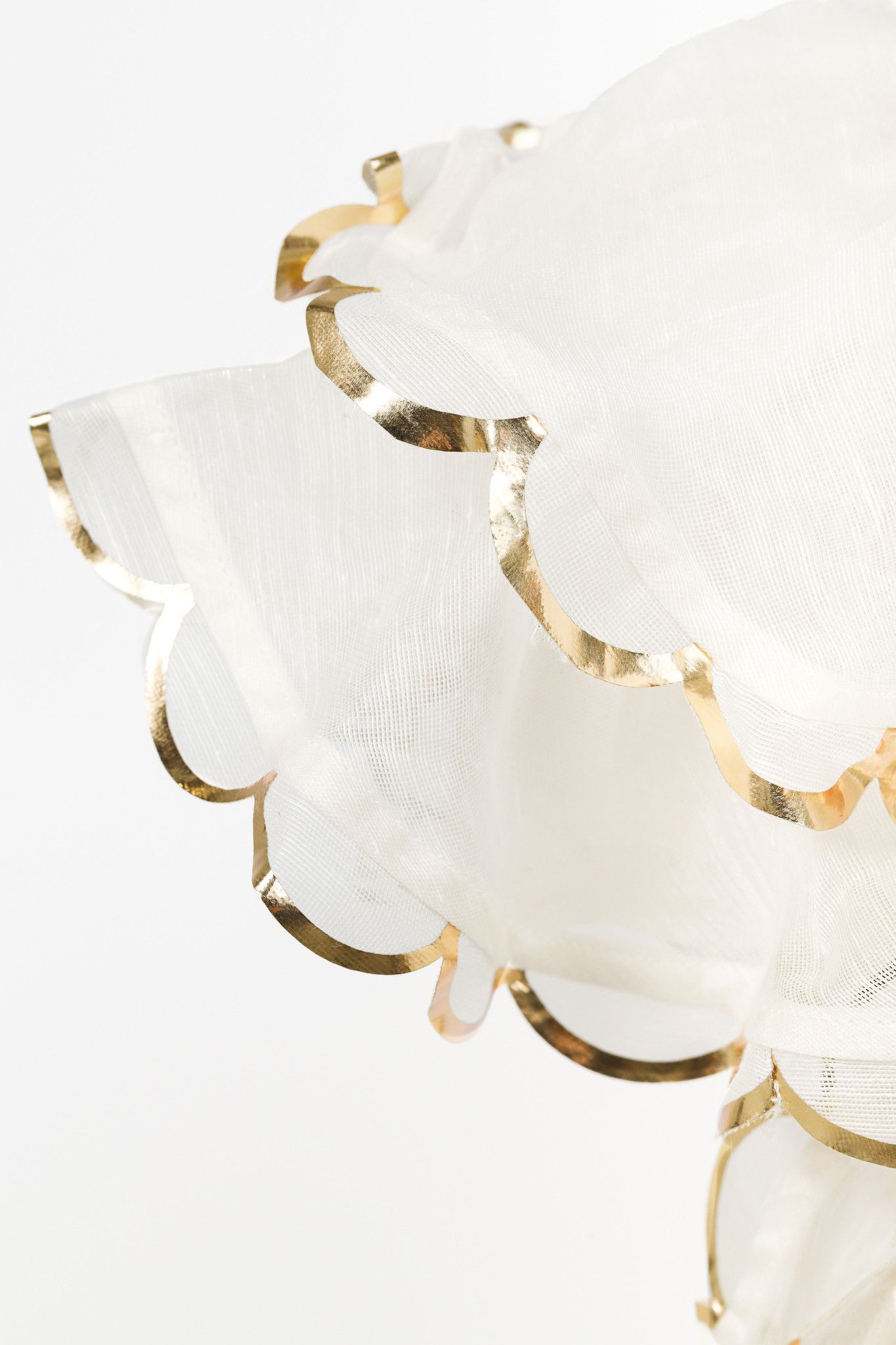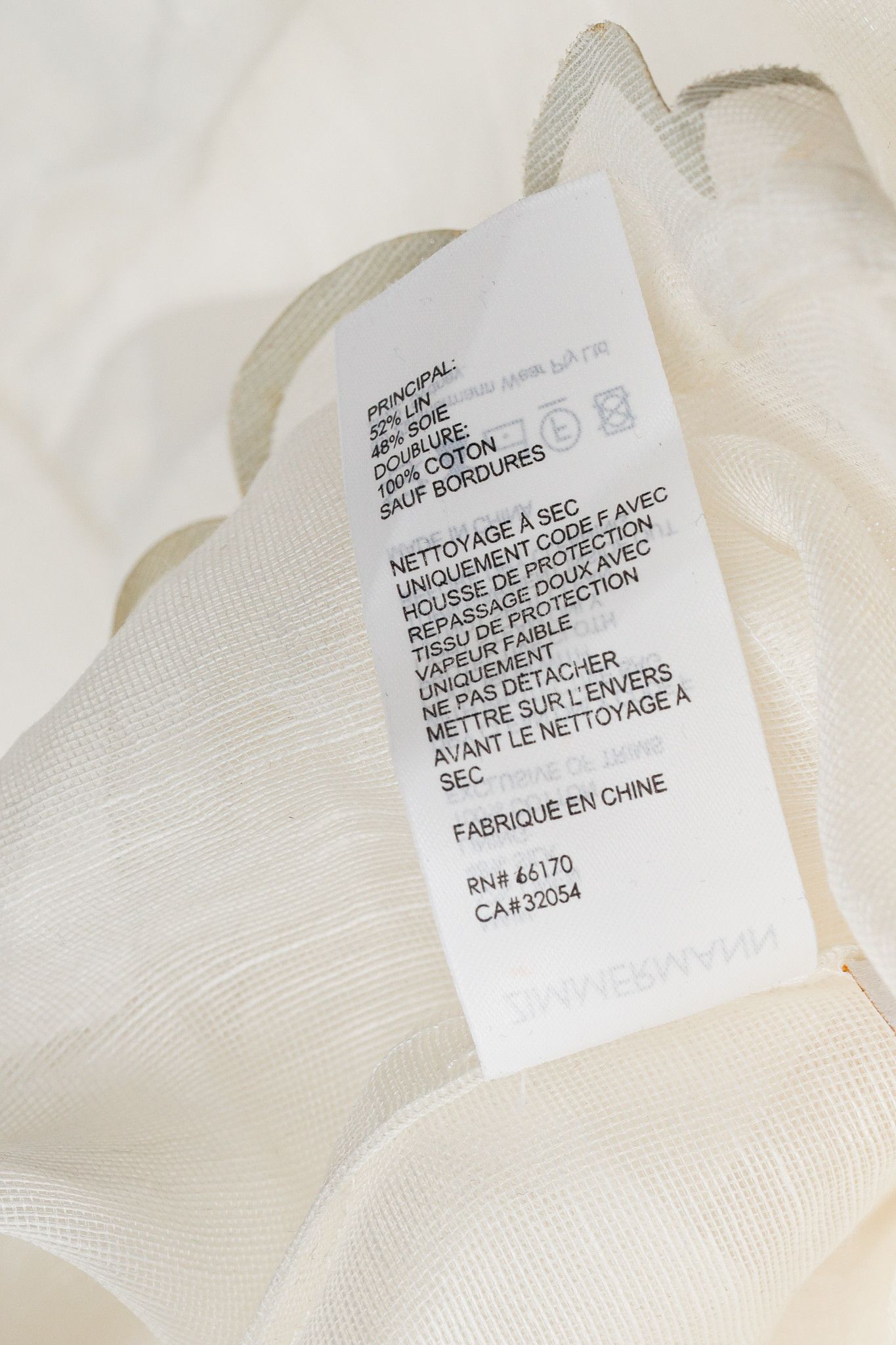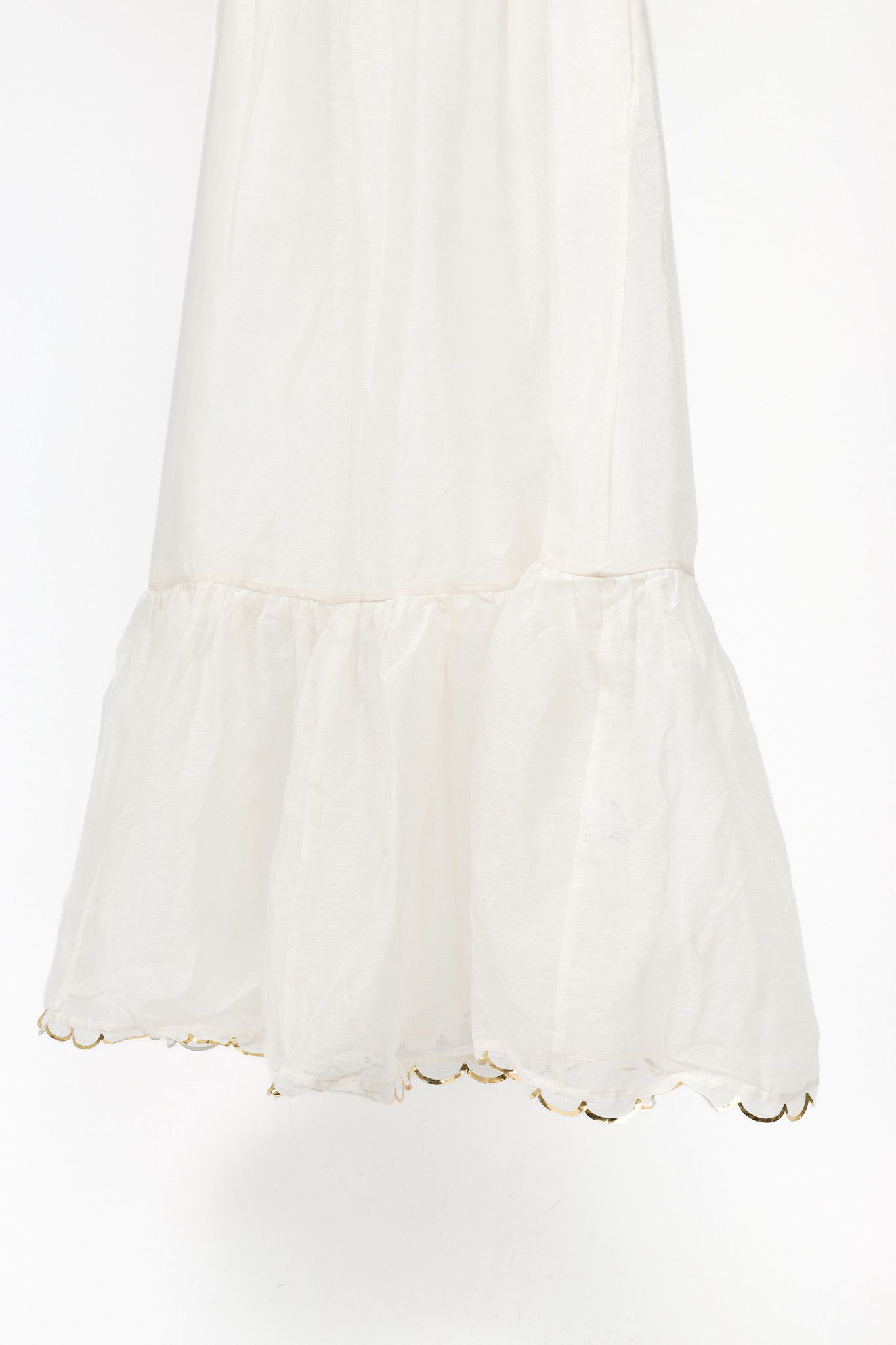This Dancer dress from Zimmermann´s 2022 Spring collection is crafted in an Ivory linen and silk-blend organza, and is trimmed with gold foil scallops. It features tiered frilled cap sleeves, a round neck, a gathered empire waistline, a ruffled midi-length hem, an invisible zip at the centre back, and is lined in a tonal gauze.