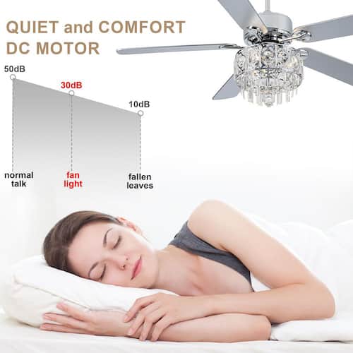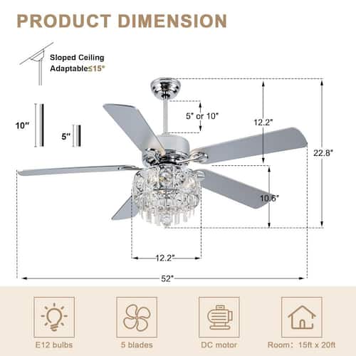 About This Product:This elegant crystal ceiling fan features 5 sleek blades and is adorned with sparkling crystals, adding a touch of luxury to any room. The fan offers 6 adjustable speeds and operates quietly, ensuring a peaceful environment. The included handheld remote control allows you to easily adjust fan speed and light settings from anywhere in the room. Designed for indoor use, this ceiling fan features a reversible motor, making it perfect for both summer cooling and Winter air circulation. Enjoy year-round comfort and style with this versatile ceiling fan. Please note that standard bulbs are required but not included. Bulb Size: 3 x E12.