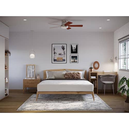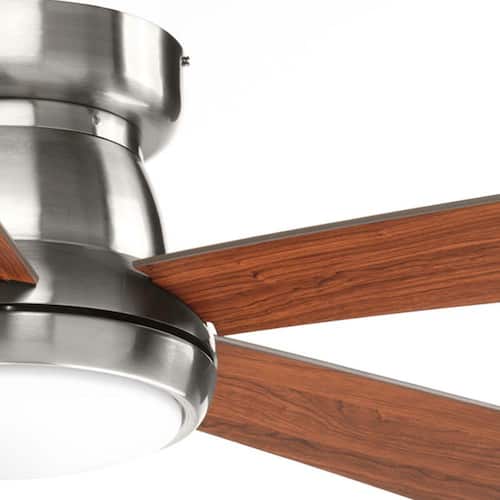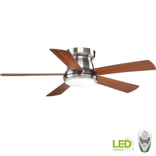 About This Product:5-blade 56 in. Vox Hugger ceiling fan features an LED light source, offering both form and function with energy- and cost-savings benefits. A shatterproof, white opal shade contains a 17-Watt dimmable, 3000K LED module. A remote control with batteries is included. The fan mounts close to the ceiling.