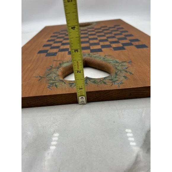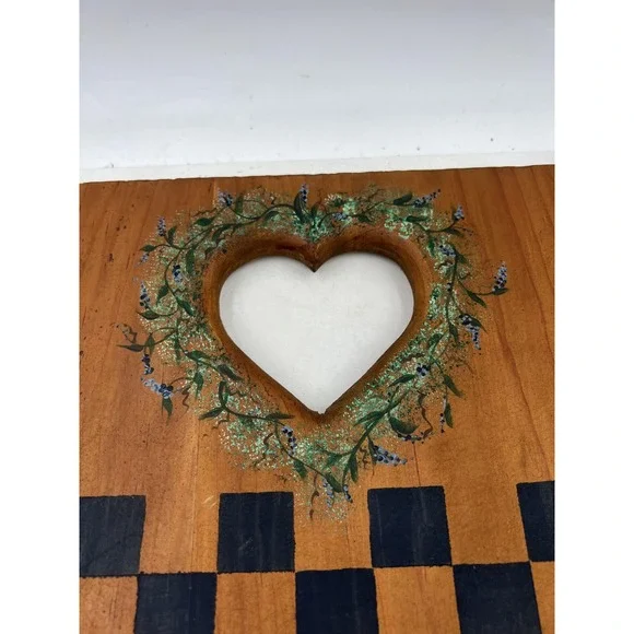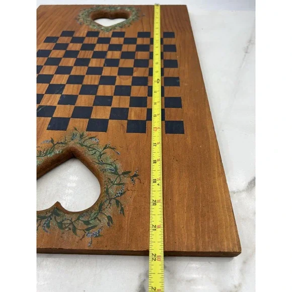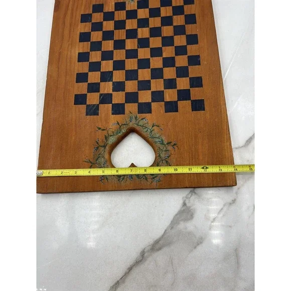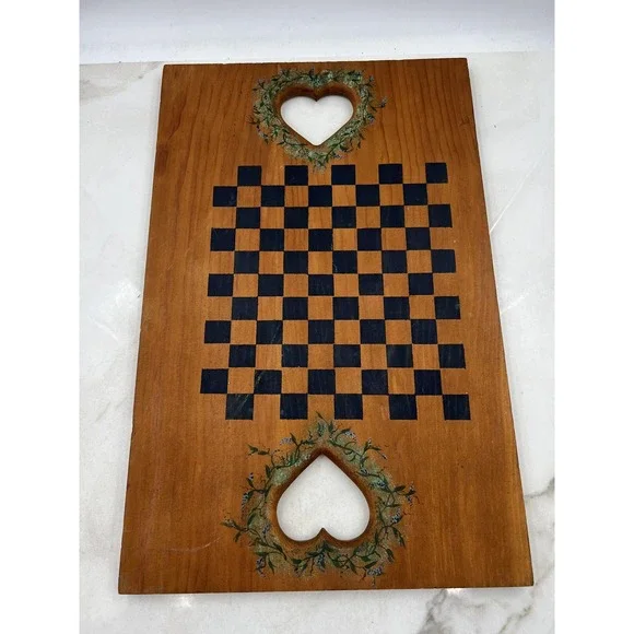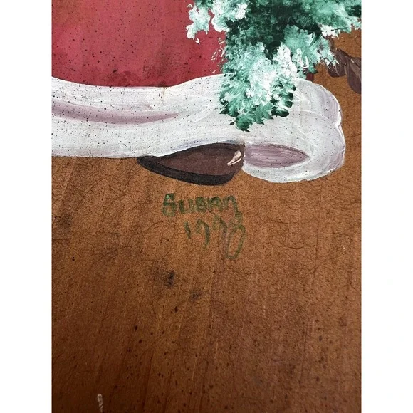 Vintage 1978 hand painted wooden game board featuring Santa Claus and holly artwork on one side and a checkers/chess board on the other, signed Susan 1978.Condition: Good vintage condition with moderate wear from age; one corner has a chipped area exposing the wood (see photo), some surface marks and scratches consistent with age.Hand painted Santa Claus motif with a flocked Christmas tree, decorative holly sprig, and festive colors; signature "Susan 1978" beneath Santa illustration.Double-sided design: one side features Santa artwork, the other side has a hand painted black checkerboard/chess board with floral wreath detail around two heart-shaped cutout handles.Made of solid wood; sturdy with natural grain showing through the finish.Approximate dimensions: 20 inches long, 12 inches wide, and 1 inch thick.Great display piece for holiday decor, country home kitchens, or as a unique vintage game board.Board only, no game pieces included.