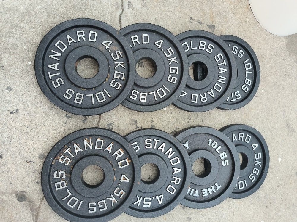 SET OLÍMPIC PLATES METAL. 80 LBS IN PLATES. $70.