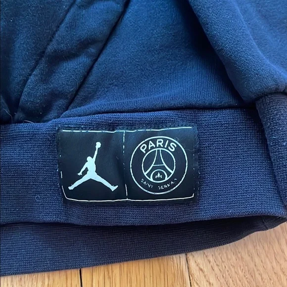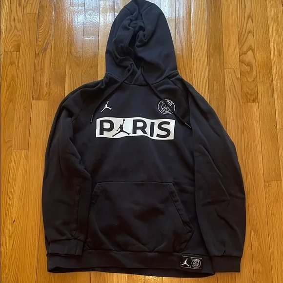 Stylish Jordan Paris Saint-Germain hoodie in black. Features iconic logo and branding. Notice small flaws - red bleach markings on front and underside of arm. Not super noticeable.