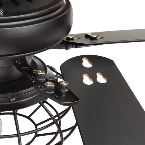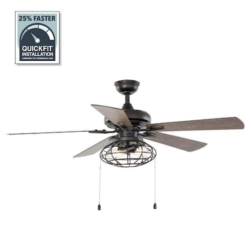 About This Product:The Home Decorators Collection Ellard 52 in. Matte Black Ceiling fan has a unique cage light kit and included 7-Watt Edison style LED bulbs for energy efficiency. Also, can be installed with either seasoned wood or black blades to coordinate with your furniture or floors. The quick install blade system allows for faster installation.