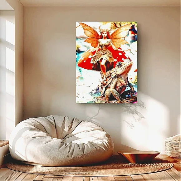 Step into a whimsical forest where fantasy comes alive. This enchanting artwork features a graceful fairy, adorned in a gown of leaves, perched atop a vibrant red mushroom. Beside her, a charming frog, equipped with a tiny satchel, adds a playful touch to the scene. The intricate details of the fairy´s wings and the frog´s expression invite viewers to explore the magic of this serene woodland setting. Perfect for those who appreciate a blend of nature and imagination, this piece will bring a delightful charm to your space.