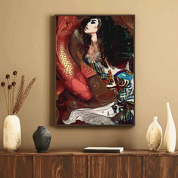 This captivating Digi-deco artwork, from MalloryJane´s Series "The 50 Nereids, Greek Goddesses of the Sea" intertwines the fluidity of water with the allure of fantasy. A striking koi fish glides gracefully alongside the Nereid, "Glucé", (who is said to dance in the green-gray waters of the world´s oceans) merging the realms of nature and imagination. The vibrant colors and intricate patterns evoke a sense of movement, inviting viewers to explore the depths of this surreal composition. The artist´s passion shines through, creating a piece that not only engages the eye but also sparks curiosity. This artwork would make a compelling addition to any space, offering a unique focal point that inspires conversation.Please note that this offer is for an unframed canvas print 18" wide x 24" tall**Custom sizes are available as well as any preferred format (printing on high quality photo paper is less expensive than canvas)*If you are interested in alternate sizes and/or presentation formats, don´t hesitate to reach out and ask for a new quote!Happy Poshing!