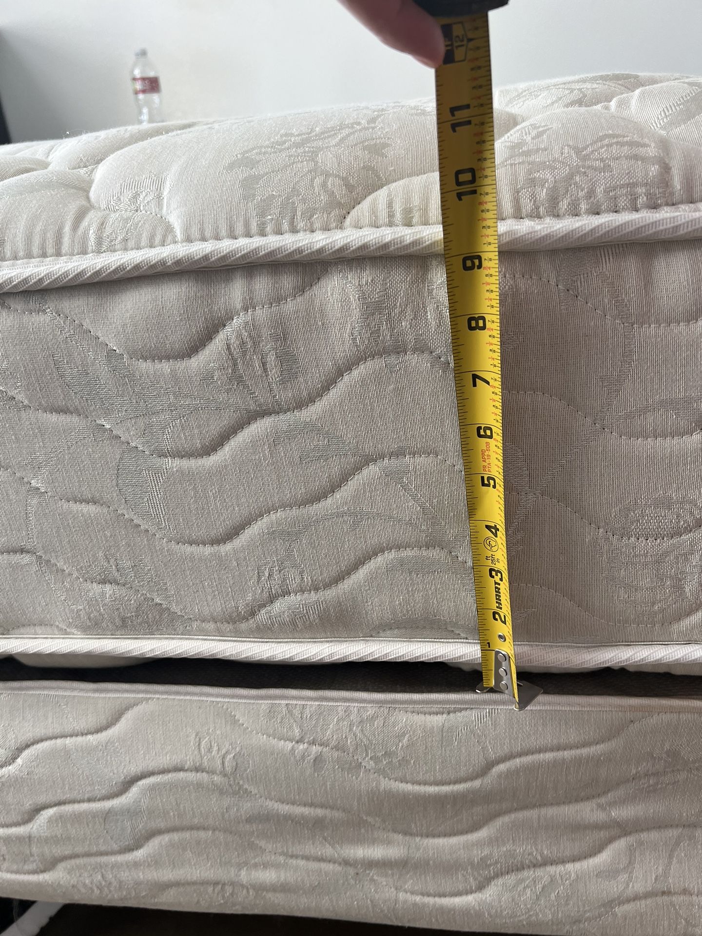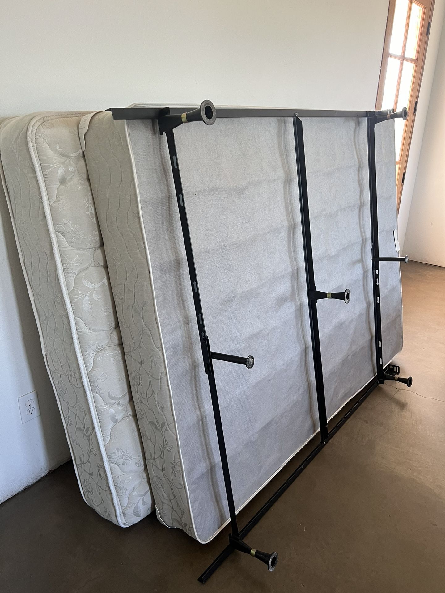 Includes box spring and metal frame. In good condition, has always had a bed protector. Provides good support