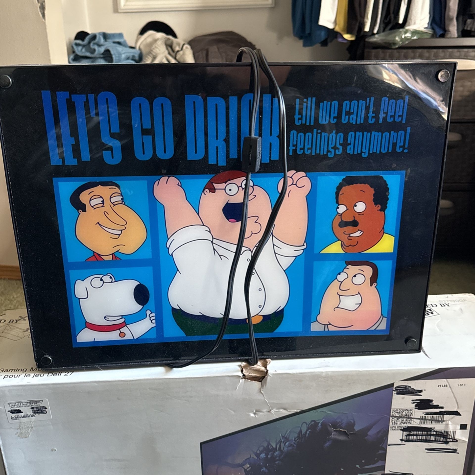 Family Guy Beer Light that says “Let’s Go Drink till we can’t feel feelings anymore”
