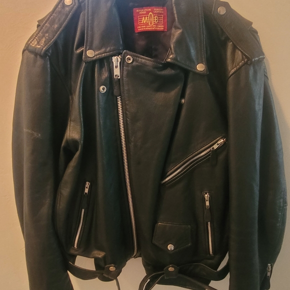 Elevate your style with this classic black leather biker jacket. Perfect for a rugged, timeless look.
