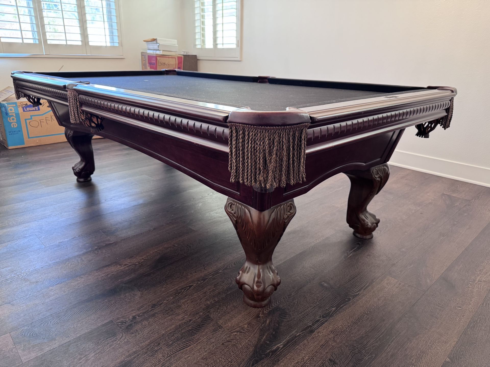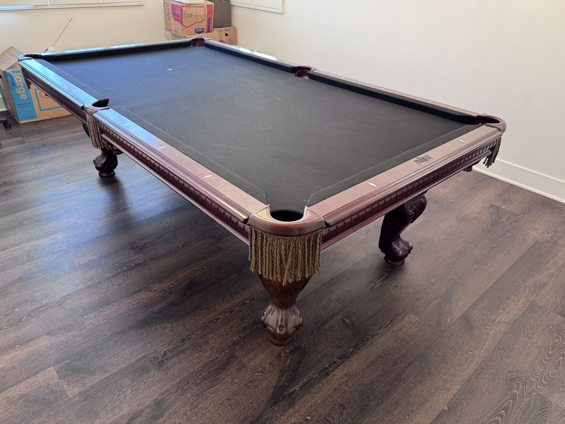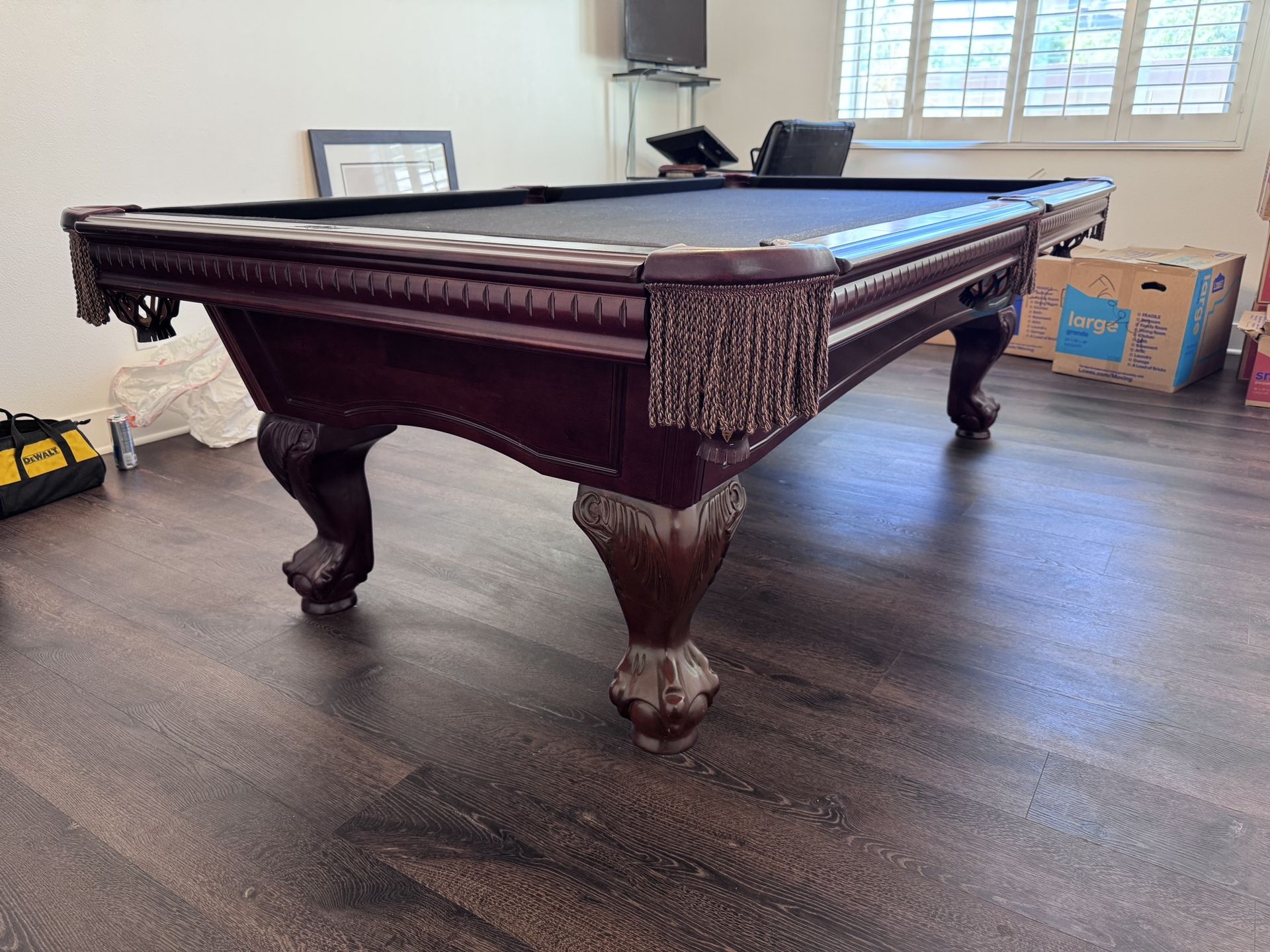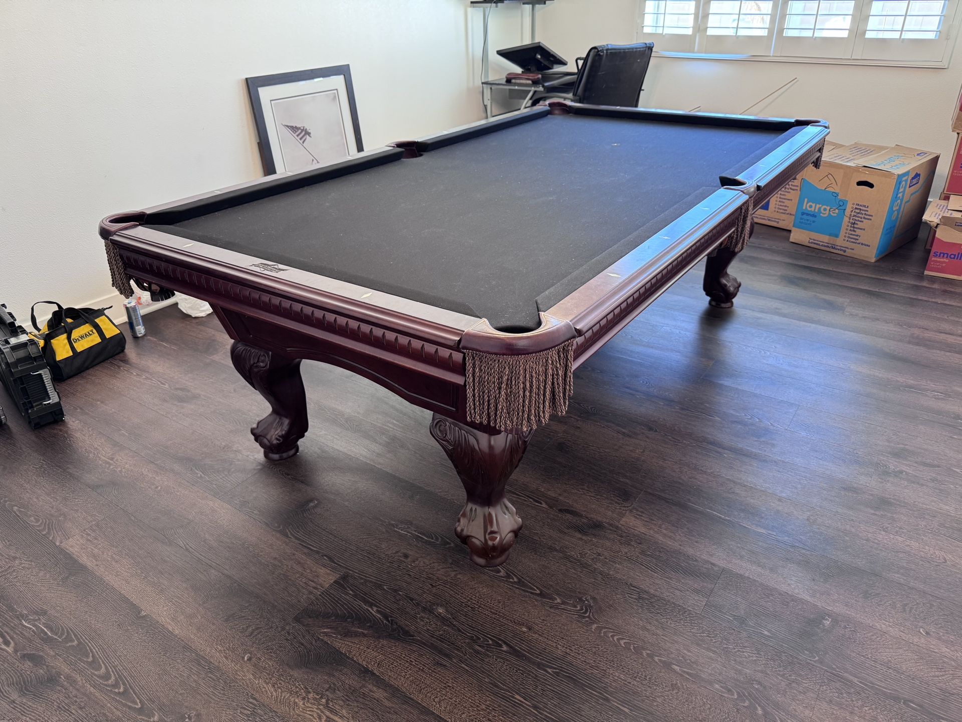 8ft Pool Table- “American Heritage ”Free delivery & install and leveling leather pocketsSolid Wood3 Piece Slate, 1"thick OIS Accessories:1 Setof balls4 Cue sticks1 Bridge stickTriangle / DiamondWall rack1 brushPayment methods:Cash or Zelle. Lo we can send you an invoice via emall.Half of the total is due upon purchase.Remaining balance due upon delivery.Please contact with any questions or to set an appointment to view the table!