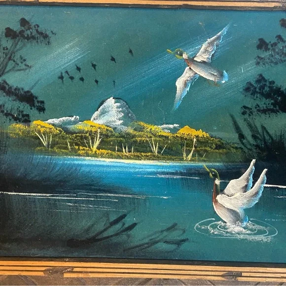 Vintage 70 Black Velvet Mallard Duck Painting SignedIn Rustic Wooden Frame Size 12.5”x22.5”Preowned Good Condition