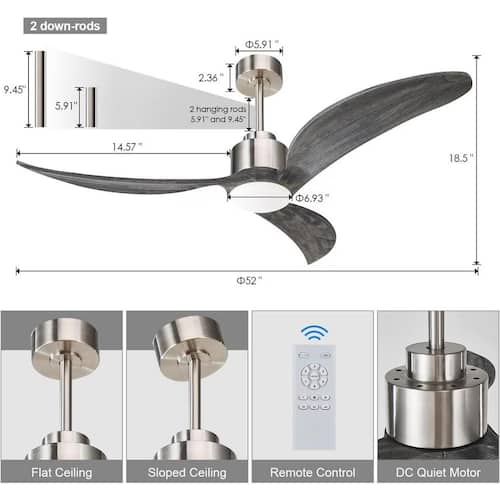 About This Product:Enhance your space with this 52" ceiling fan featuring wood blades and a modern industrial design. With 6 speed levels, dimmable LED lighting, and a reversible DC motor, it´s perfect for any season. The multifunction remote adds convenience, while adjustable height and pitched ceiling compatibility ensure effortless installation. Stylish, quiet, and energy-efficient-perfect for any room!
