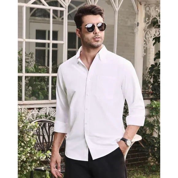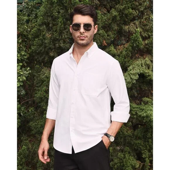 Material: This casual shirt made in high-quality cotton for a breathable and strong feeling. Oxford fabric will gets softer with each wear.Design: Mens solid oxford Shirt, long sleeve, button-down front closure, back pleat, adjustable cuff for a tailored look and ensuring more flexibility when moving.Features: Collar with button closures can be worn with or without a tie, classic design chest pocket holds your essentials.Occasions: Casual/ Dating/ Work/ Daily life, perfect for any casual occasions. It´s also a perfect gift for husband, son, dad or friends.