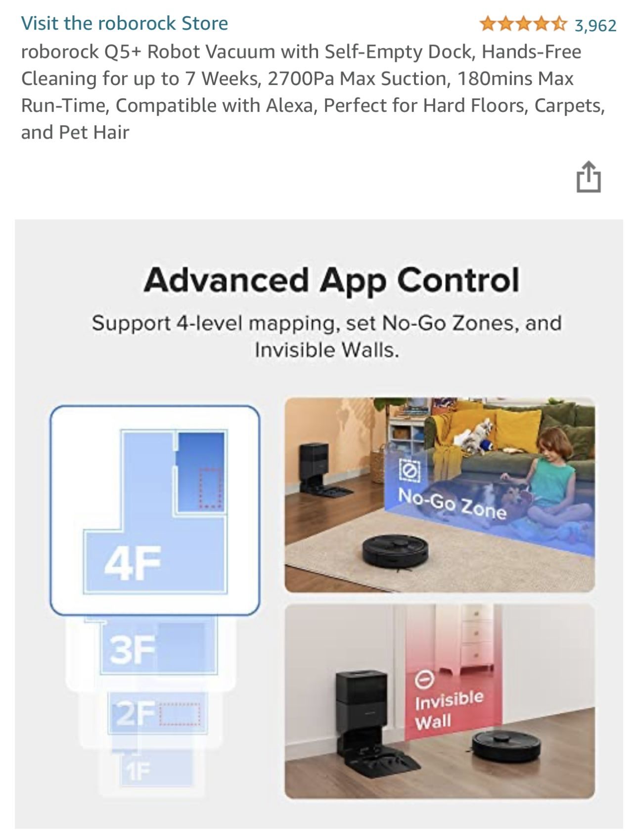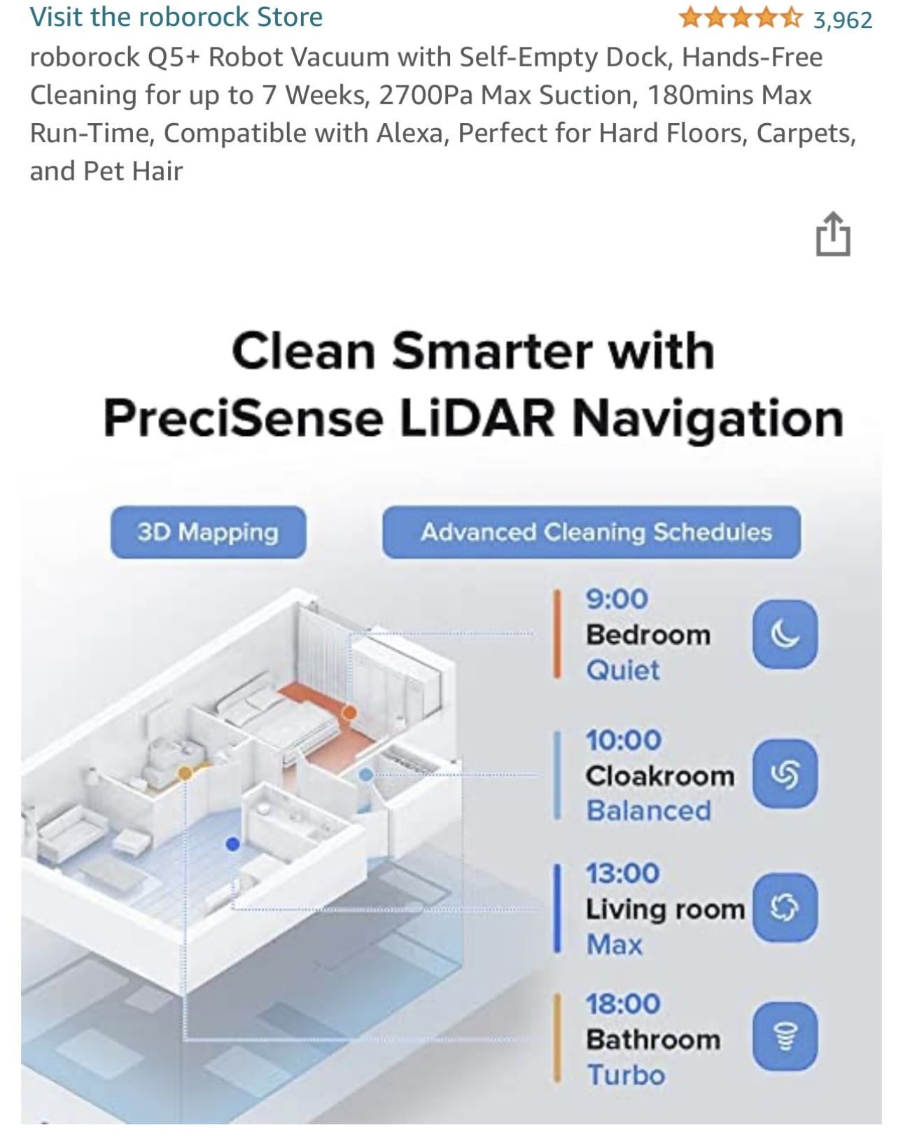 Brand new. Sealed in box. roborock Q5+ Robot Vacuum with Self-Empty Dock, Hands-Free Cleaning for up to 7 Weeks, 2700Pa Max Suction, 180mins Max Run-Time, Compatible with Alexa, Perfect for Hard Floors, Carpets, and Pet HairBrand RoborockModel Name Q5+Surface Recommendation Hard Floor, Carpet, Wood, TileSpecial FeatureLidar Navigation with 3D Mapping, Powerful 2700 Pa Suction, Self-Empty, Self-Emptying, No-Go Zones and Invisible Walls, Multi-Level Mapping, App Control, Voice Control, Floating Main BrushLidar Navigation with 3D Mapping, Powerful 2700 Pa Suction, Self-Empty, Self-Emptying, No-Go Zones Color BlackProduct Dimensions 19.69"L x 16.14"W x 14.96"H7-Weeks of Hands-Free Cleaning: The Self-Empty Dock automatically empties the Q5’s dustbin after each cleanup, so you don’t have to do it manually or frequently. Its 2.5L dust bag can hold up to 7 weeks of dirt.Clean Smarter with PreciSense LiDAR Navigation: Extremely accurate LiDAR navigation creates precise maps that can even be viewed in 3D. You can also add furniture and floor materials to recreate your home virtually.Clean Harder with Powerful 2700 Pa Suction: With an incredible maximum suction power of 2700 Pa, the Q5 easily lifts debris and pet hair from floors and drags it out from deep inside carpets.Clean Better with the Multi-Plane Floating Main Brush: A multi-plane floating brush keeps the brush closer to the ground for deeper cleaning, even on uneven surfaces. It is strongly resistant to hair tangles and perfect for homes with pets.Keeps Going for Longer: Powered by high-capacity battery and a 470 ml dustbin, you get long lasting cleaning that can easily tackle most homes in one clean.Visit our website to view more of our items for sale!https://.co/faYXKzQFnY?$deeplink_path=/redirect/