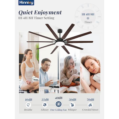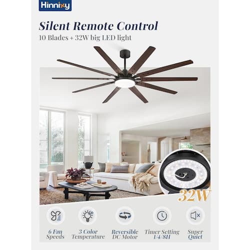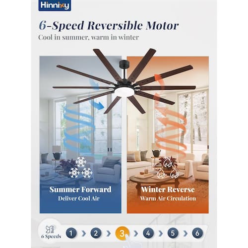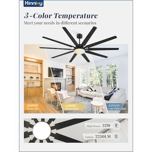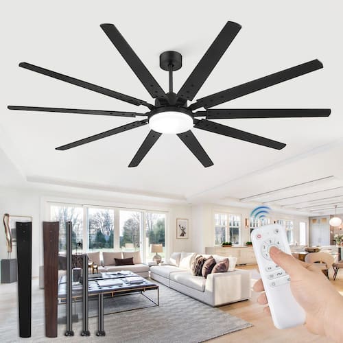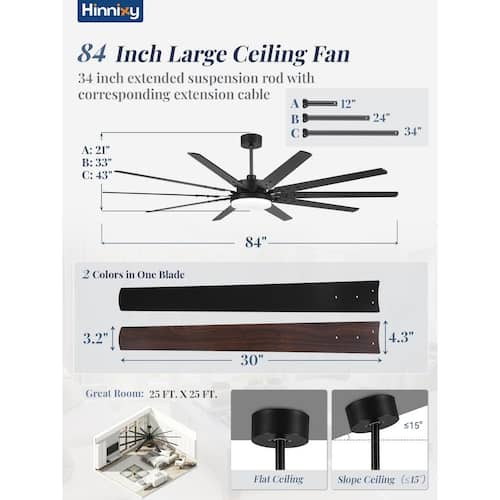 About This Product:This 90 in. ceiling fan with light and remote control has 10 dual color blades, brown and black. The large industrial ceiling fan is equipped with 3 downrod lengths (12 in. 24 in. 34 in.) and supports both Downrod Mount and Angled Mount to meet different ceiling requirements. The light of the large black ceiling fan is integrated LED, which can easily adjust 3-color temperatures, warm white (3000K), natural white (4500K) cold white (6000K) (reminder: if the power failure time is ≥5 seconds, the current color temperature is remembered, ≤5 seconds, it will switch to other color temperatures). You can adjust all functions through the remote control, 3-timing (1/4/8h), 6-wind speed, silent mode, reversible function and more. The product uses a DC reversible motor, which transmits cool air downward in summer and optimizes air circulation in winter. The operating noise is below 40 decibels to create a quiet and comfortable environment for you. We will equip you with remote control wall brackets, so that you can find the remote control in time to reduce the risk of loss. We are equipped with detailed instructions to facilitate your installation, and have a 1-year warranty service, so that you can shop without worry.