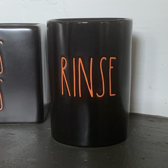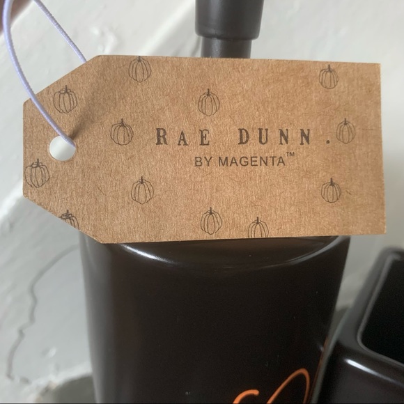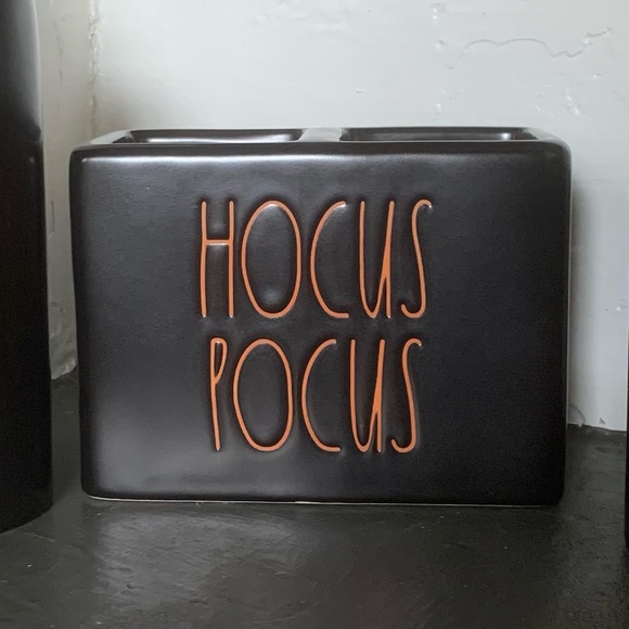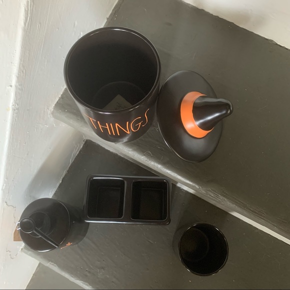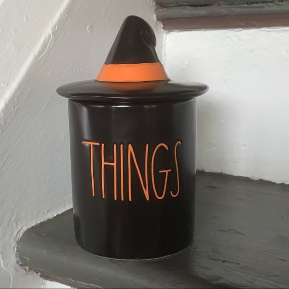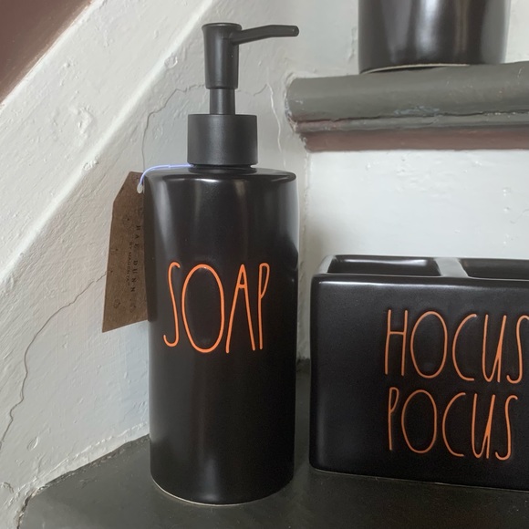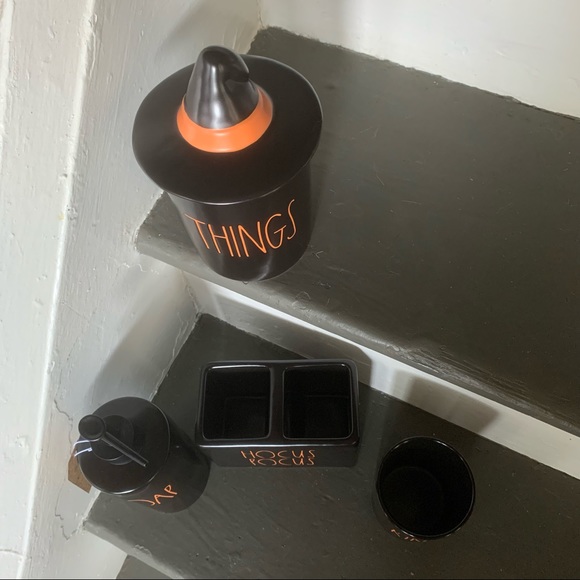 No need for your Halloween decorations to stop at the bathroom doorTHINGS black ceramic jar with witches hat lid!5” H, with lid, 4” WSOAP Pump DispenserHOCUS POCUS 2-compartment organizerRINSE ceramic cupClassic Rae Dunn font in orange!Smoke-free homeImperfections intended by artist Review pics closely-no returnsfamily together magnolia pioneer anthropology beauty wedding gift dad kitchen baby farmhouse rustic shabby chic refresh play child Christmas