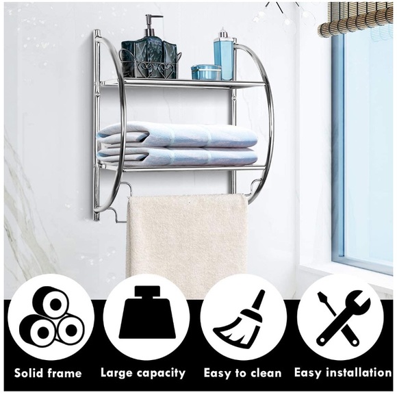 Towel bars for bathroom is a perfect drying solution for homes. This is a wall-mounted shelf that you can install it on the wall. This holder features 2 tier plates and 2 towel rails【Sturdy & Rust Proof】The wall mounted 2-tier shelf is made of chrome-plated iron. It has large loading capacity that can hold up to 8.8 lbs weights , And the material is rustproof. It’s very suitable for humid environments, such as bathrooms or laundry rooms. need to be assembled by yourself. Manual included