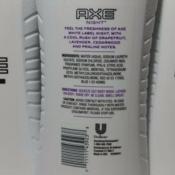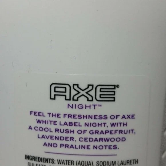 ~ Discontinued Product Line ~~ Over 2000 Available Listings with New Items Added Daily ~~ Professional full time seller ~ Fast Shipping! ~3 Bottles; 16 FL OZ AxeWhite LabelNightBody WashContains MentholFeel the freshness of Axe White Label Night with a cool rush of grapefruit, lavender, cedarwood, and praline notesUPC:0111114392383 Bottles; 16 FL OZ