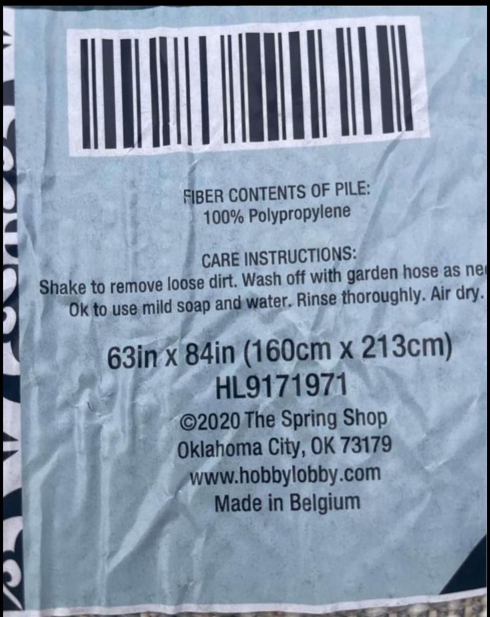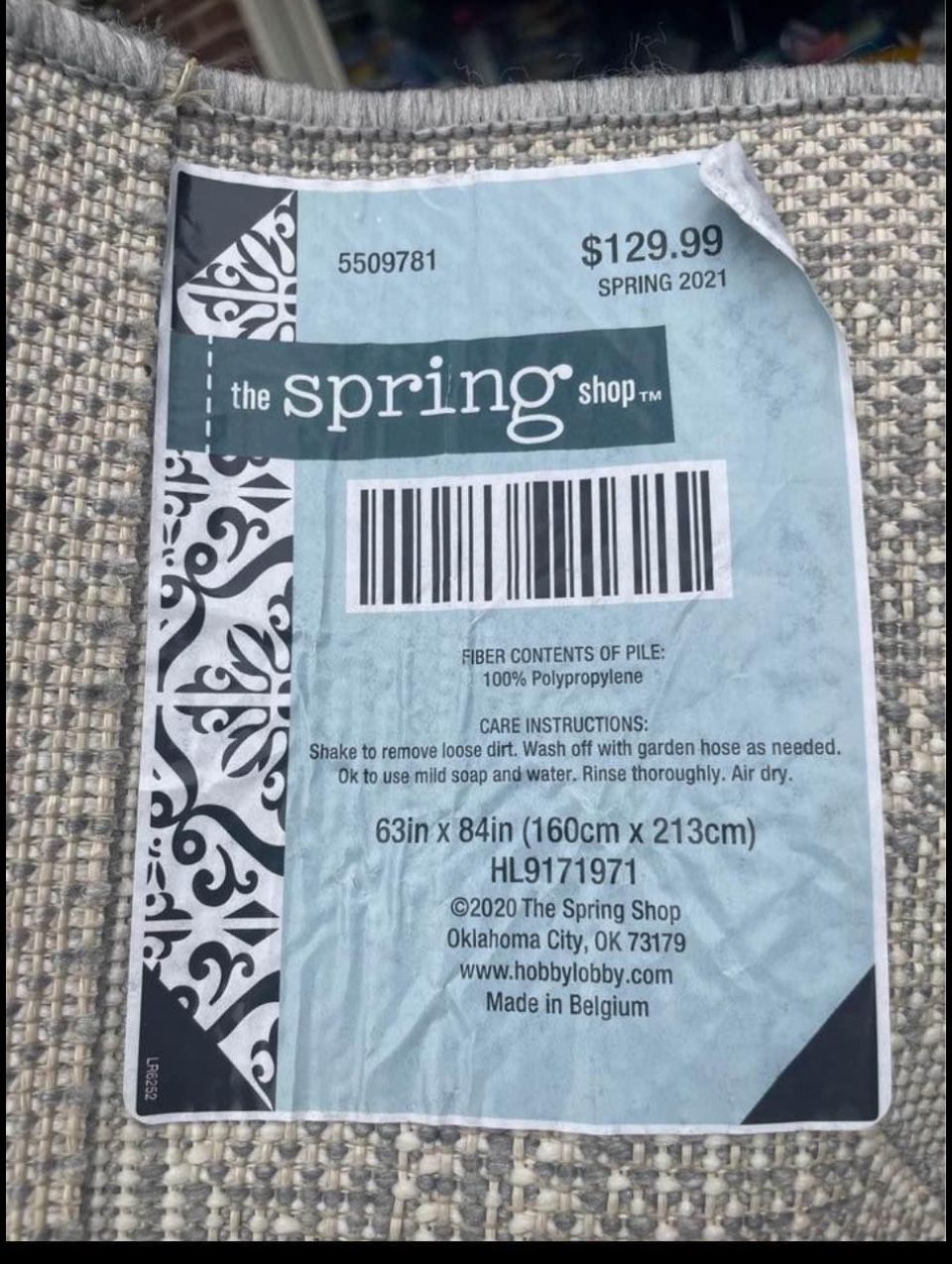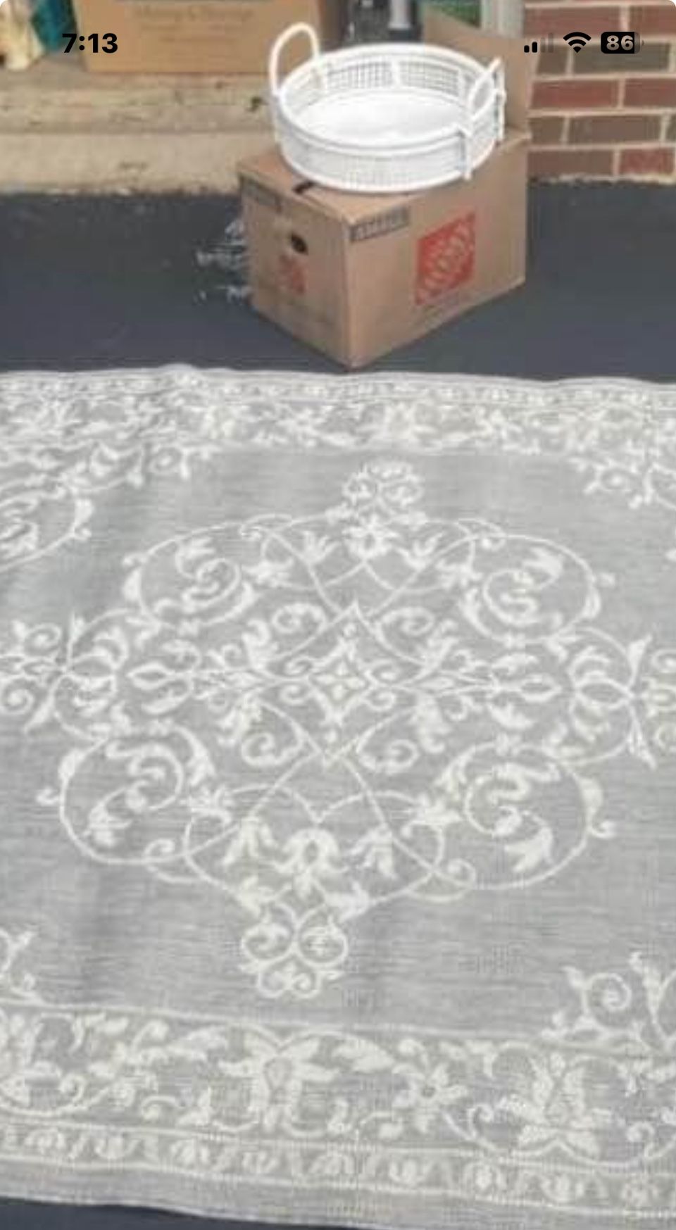 RUG INDOOR OUTDOORLike new, 1 pull see picture BUT HONESTLY i almost didn´t see it. Come check it out in person Kind of a blue/grey color ALTHOUGH i don´t know for sure, i think this might be a type of rug that can go on a covered porch, weather resistant. 63 inches by 84 inches =5.25feet by 7 feet Check out directions to clean retails 129.00Asking 50.00 cash Leesburg Pretty neutral color