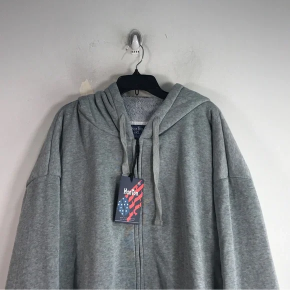 Brand: HanTonSize: 4XLMaterial: 55% Cotton, 45% PolyesterRetail: $69.99Color: Light Grey Details: Zip Hooded Faux fur linedPockets New with tags
