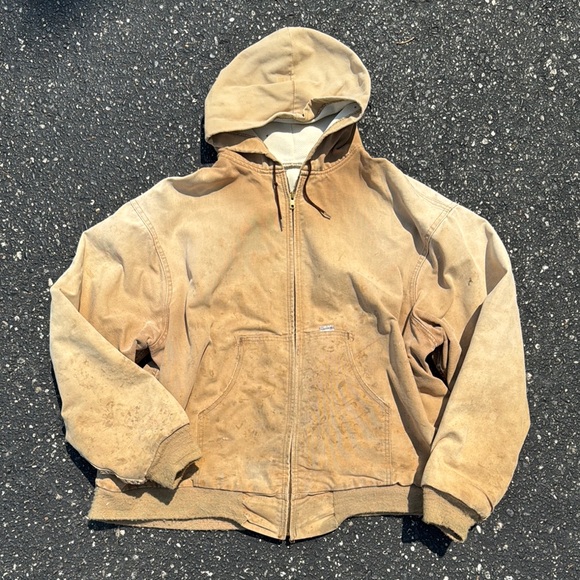 Durable Carhartt jacket with hood. Ideal for outdoor activities.