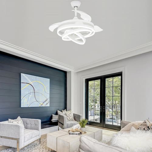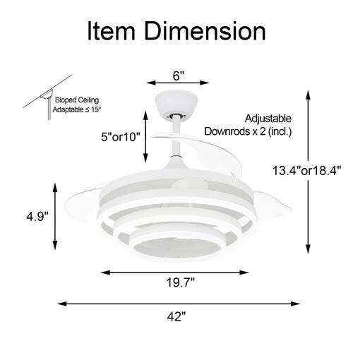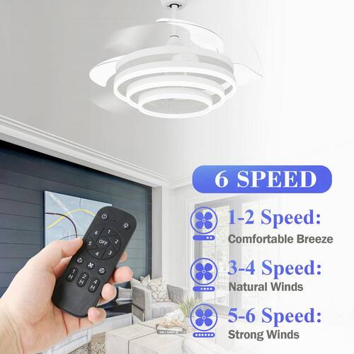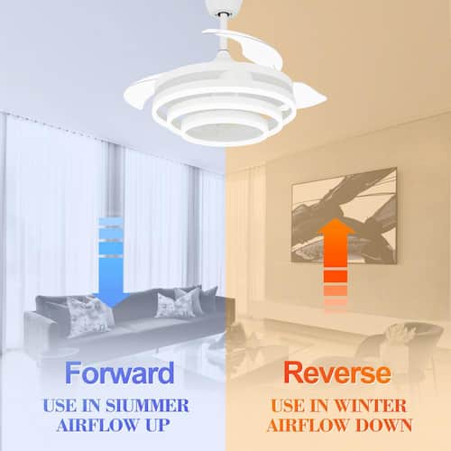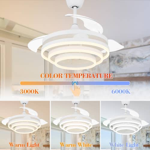 About This Product:The 42 in. retractable ceiling fan has 3 colors temperatures; 6 fan speeds; and a cool design. When not in use, the fan blade part can shrink and the lampshade can also be adjusted according to your favorite shape. The reversible DC motor can be run in winter to help circulate warm air and reduce energy costs. This retractable ceiling fan is simple, light and luxurious and very popular.