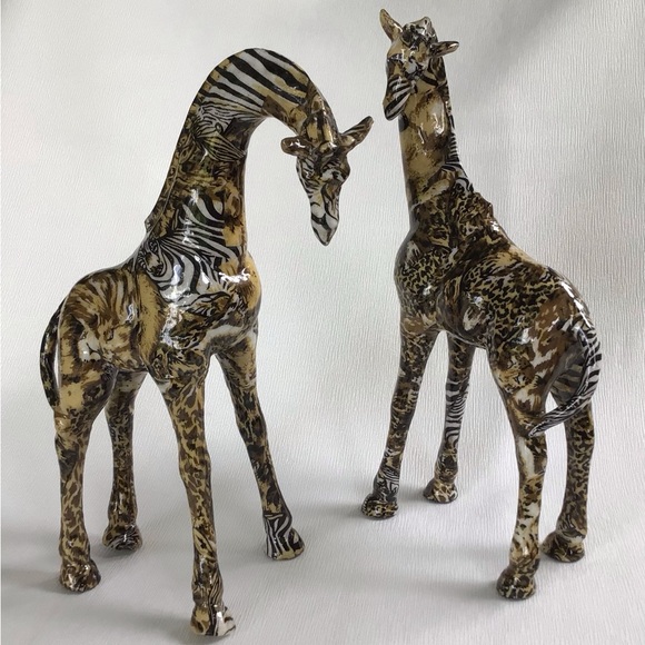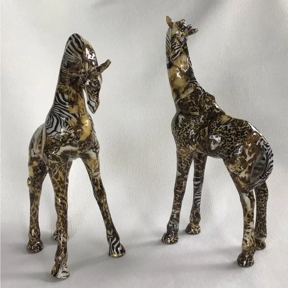 Enhance your home decor with this pair of stunning decoupage patchwork giraffe sculptures. Featuring a captivating blend of brown and black, these pieces add a touch of elegance to any space.