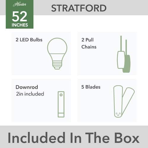About This Product:The Stratford is a 52-inch fan with wide appeal. Soft, rounded lines throughout the fan´s body, blades, and glass provide a graceful, casual style that fits right in with almost any large room. The cased white glass and the included LED light bulbs provide ambient light in your space. Control the light and fan speed with the included pull chains.