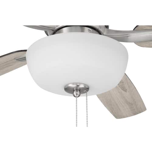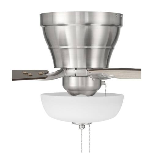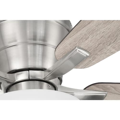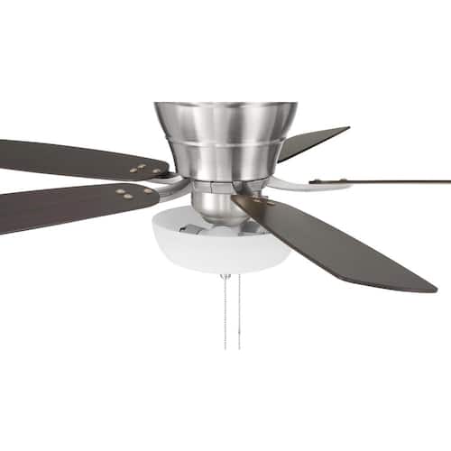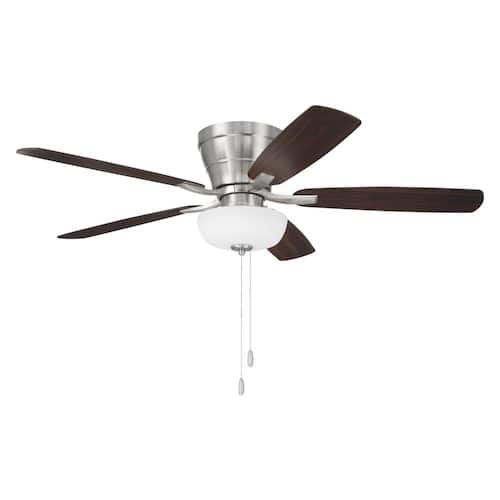 About This Product:Designed to deliver both charm and function, the Wheeler 52 in. Indoor Ceiling Fan in Brushed Polished Nickel brings timeless style to rooms with lower ceilings. This flush-mount fan includes five reversible Driftwood/Walnut blades and a two-light bowl fixture with frosted glass that provides warm, ambient lighting. Complete with two dimmable LED bulbs and a 3-speed reversible motor, Wheeler offers dependable comfort and efficient air movement-making it a smart choice for bedrooms, kitchens, and other compact indoor spaces.