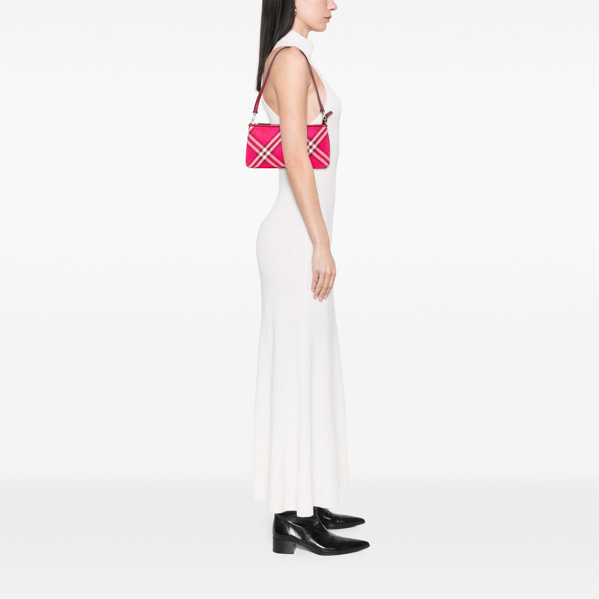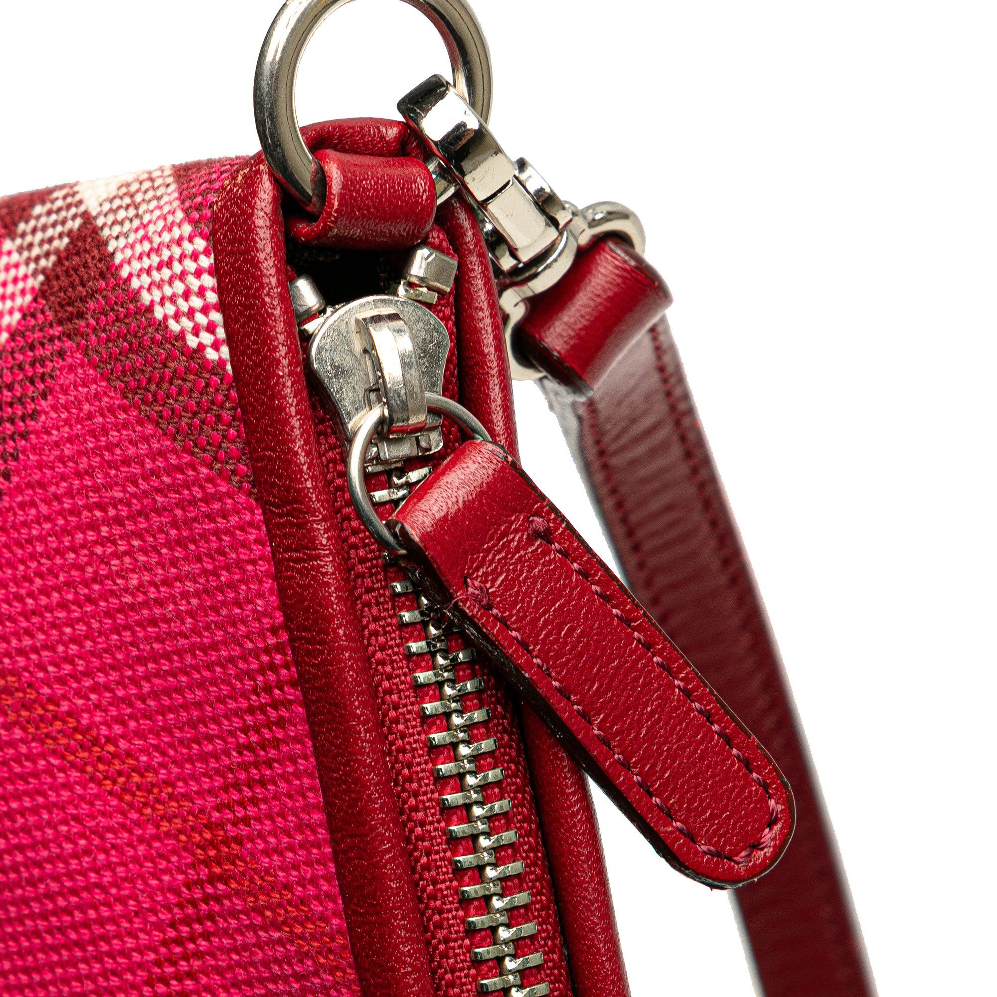 This shoulder bag features a canvas body with leather trim, a flat leather strap, a top zip closure, an exterior zip pocket, and interior slip pockets. It carries a Good condition rating. Exterior Corners Worn. Exterior Handle Cracked. Interior Lining stained with Other. Practical Attachment Scratched. Exterior Top Worn. Zipper Scratched.Dimensions: Length: 14.00 cm Width: 25.00 cm Depth: 3.50 cm Shoulder Drop: 25.00 cm Includes: None, No longer comes with original accessoriesColor: PinkMaterial: Fabric x Canvas x Leather x CalfCountry of Origin: United kingdomYear of Manufacture: 2000-2017