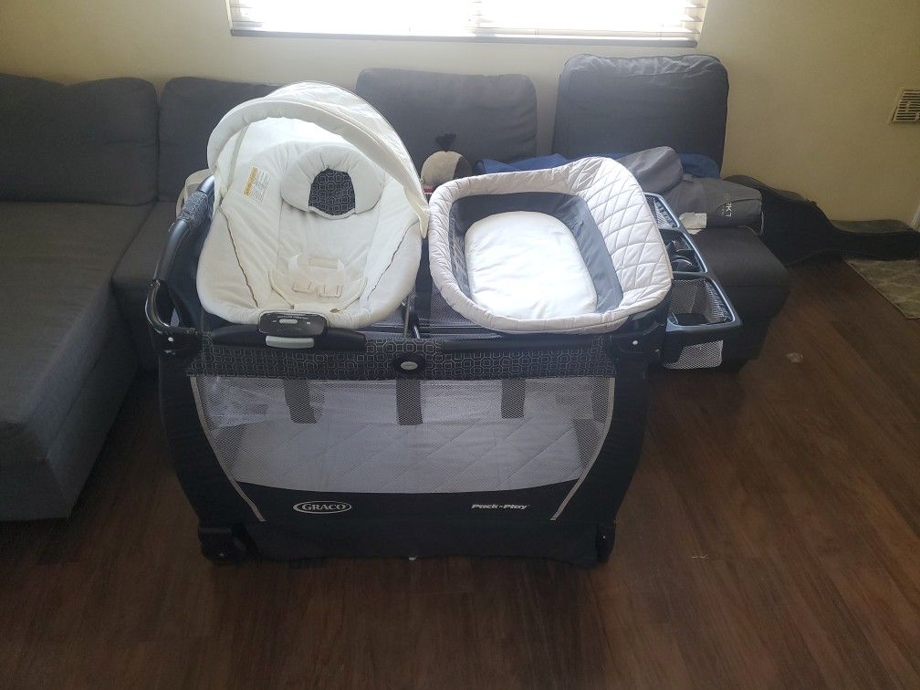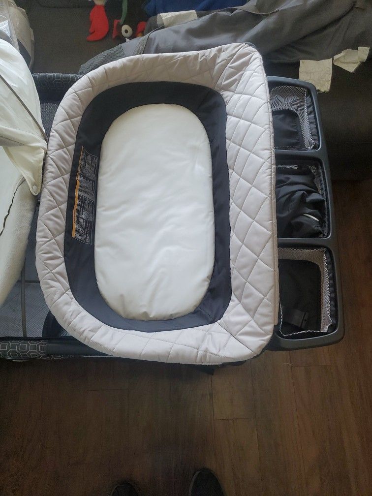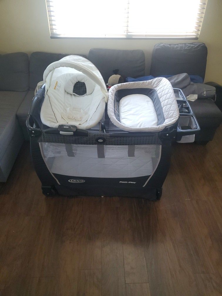 Used good condition two levels...changing table adapter...diaper and wipe storage...floor bouncer...all snaps together for easy storage...play pen carrying bag included...perfect for travel and hotel stays...still available...6/18/24