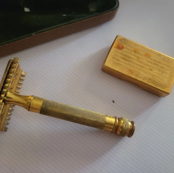 Cool antique Gillette razor in box. Box with velvet interior and gold printing. Goldtone brass razor and blade box. This is from an older estate, and they had it stored in a drawer for many years. May need some adjustments and deep cleaning for use today, like most antique items. However, it would make a great display piece, especially in a barber shop. We are a smoke-free and pet friendly home. Items are cleaned as able and stored in plastic away from pets until they are shipped. Thank you.