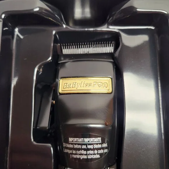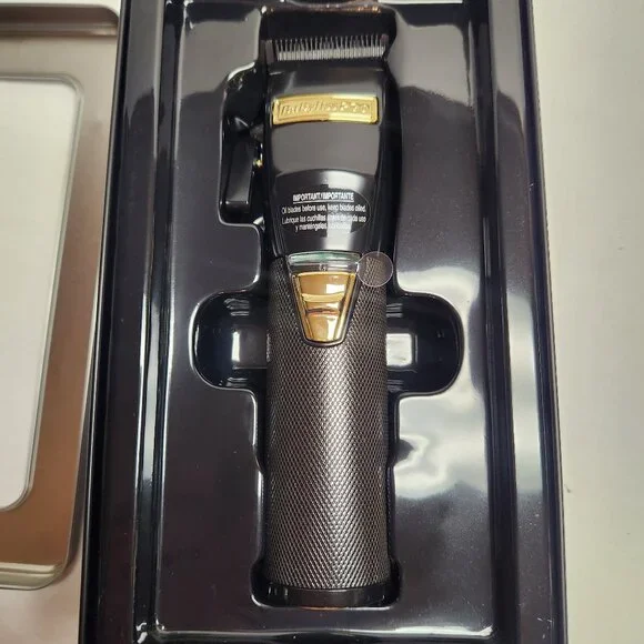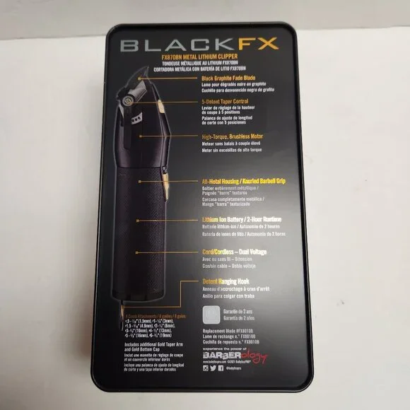Brand new in box Babyliss Pro Black FX adjustable cordless clipper model X870BN-Features: black graphite fade blade, 5 detent taper control, high-torque brushless motor, all metal housing/knurled barbell grip, lithium ion battery/2 hour runtime, cord/cordless-dual voltage, detent hanging hook.-Includes: additional gold taper arm and gold bottom cap, 8 attachment combs.-Made in China