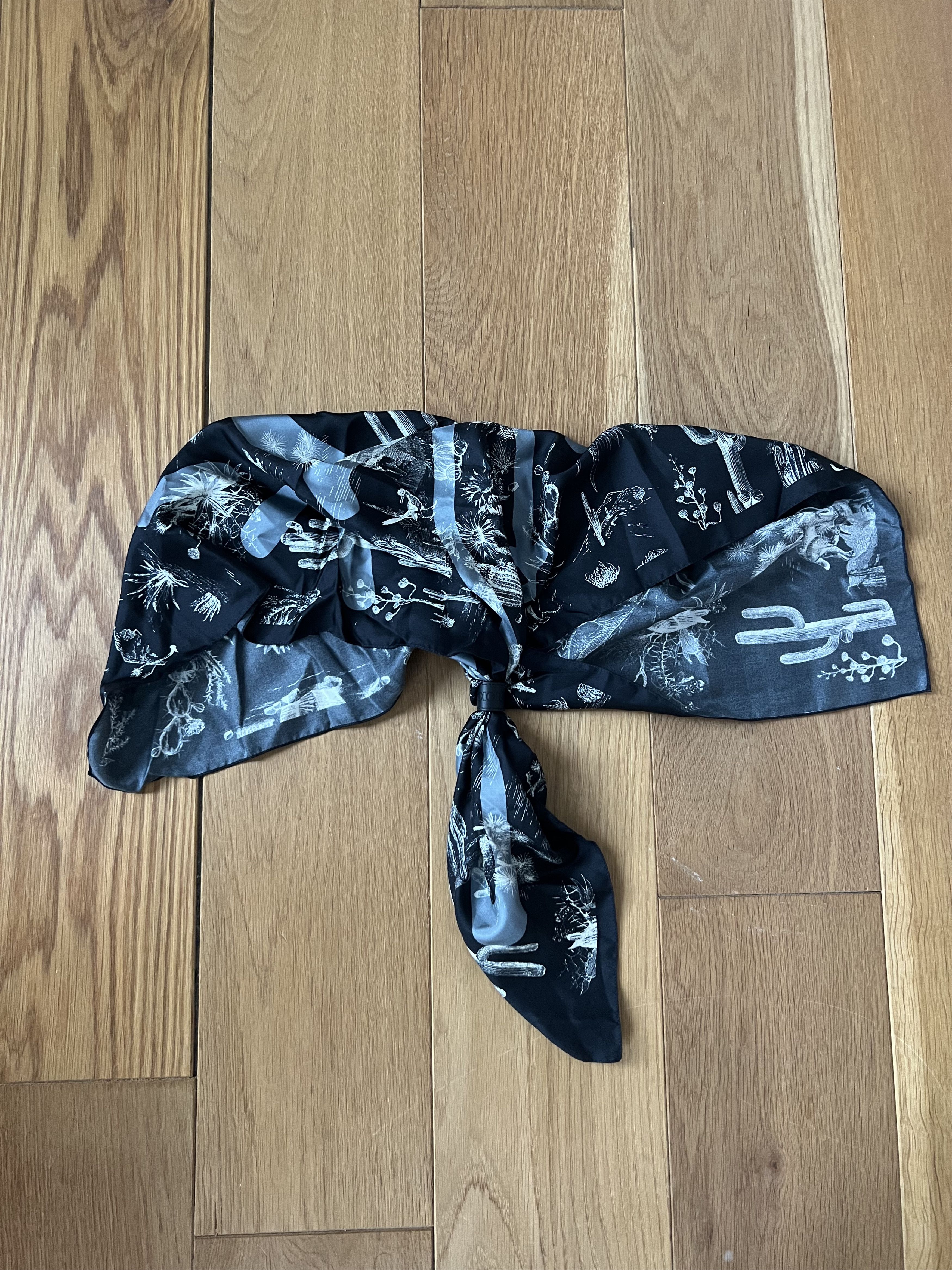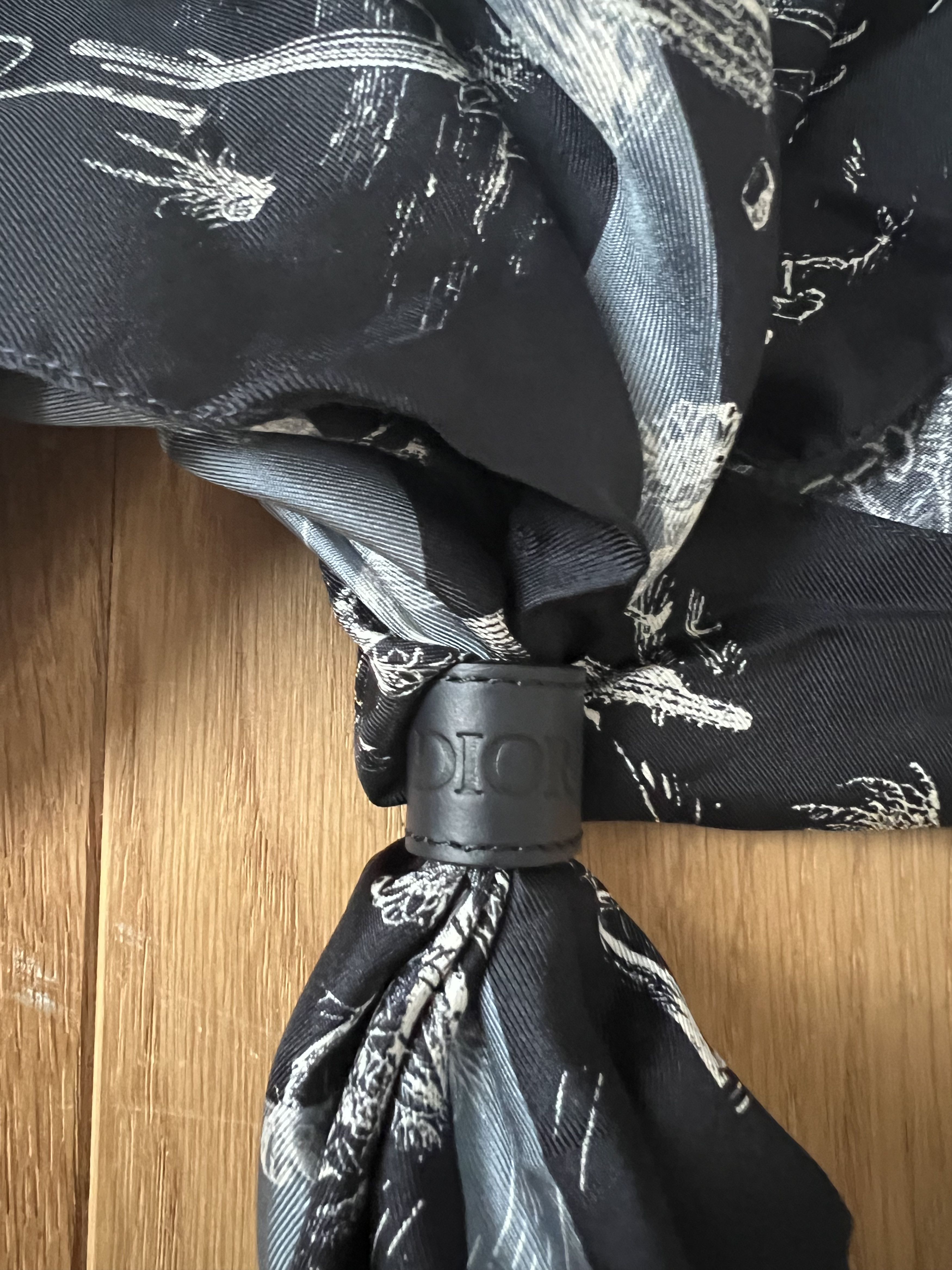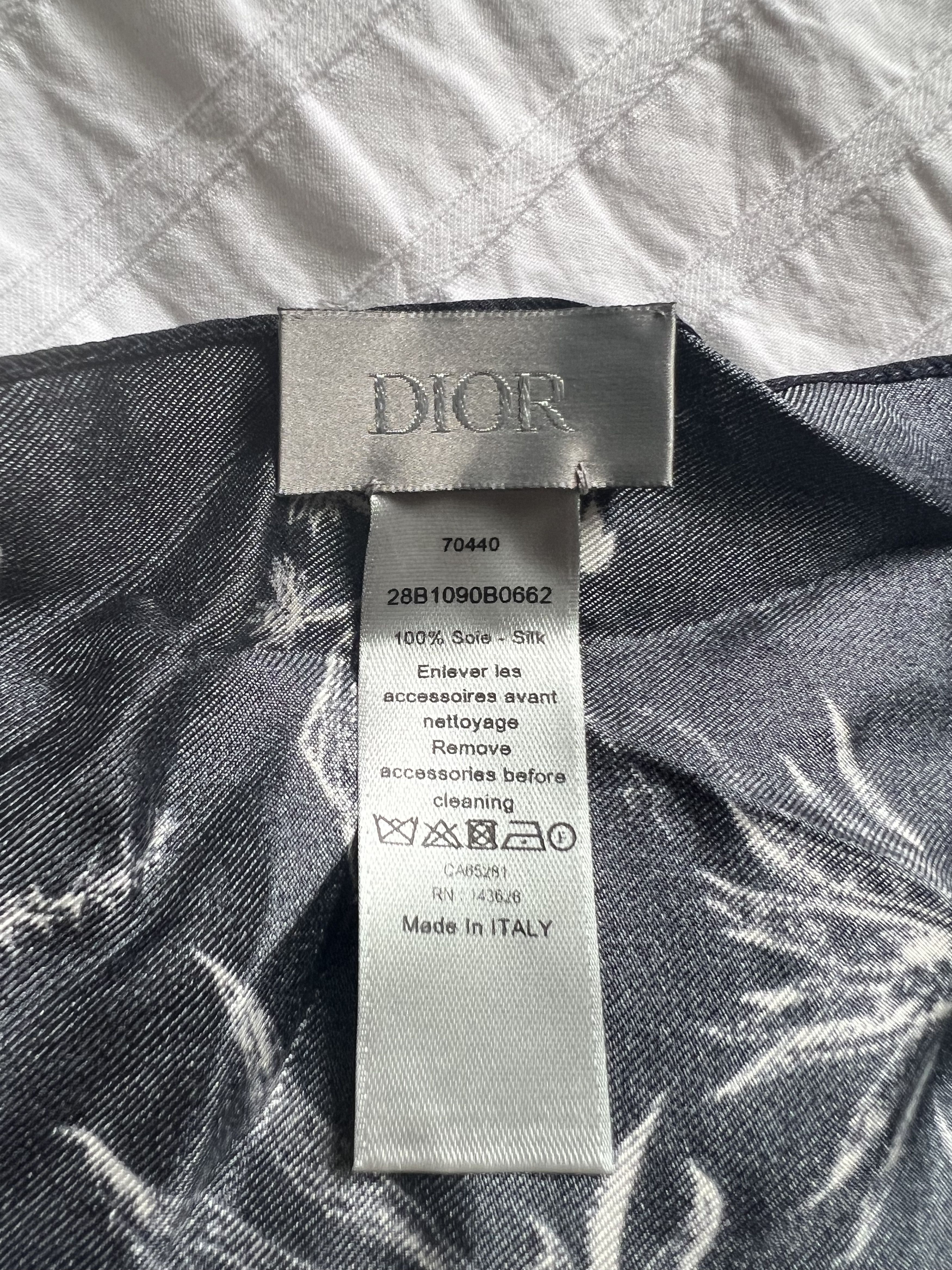 Very, very, very rare unreleased Dior Cactus Jack Bandana (gifted to friends and family prior to Travis Scott´s collection with Dior Homme being initially cancelled)Brand new with tags, comes with a small Dior branded ring so it can be worn around the neck like a scarfDark navy with light blue Cactus Dior motif and white tropical print100% silkMade in Italy 28 x 28 inches