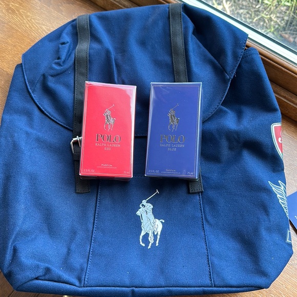 Brand new parfum bottles 2.5oz blue & red polo Ralph Lauren fragrances.Included polo tote bagRetail values over $200+