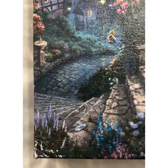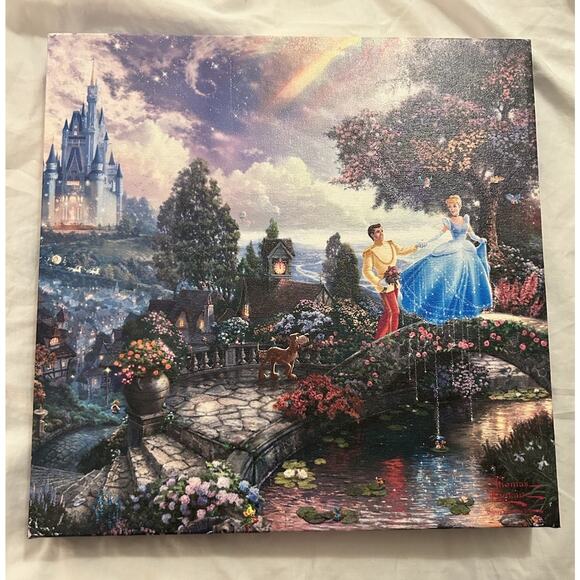 Thomas Kinkade Cinderella Wishes Upon a Dream 14x14 Gallery Wrapped Canvas COA See photos for condition. Phots are listed of the corners.The Thomas Kinkade Accent Print "Cinderella Wishes Upon a Dream", and It is a 14x14 Gallery Wrapped Canvas, a beautiful piece from Thomas Kinkade´s Disney Dreams Collection. This artwork captures the enchanting scene of Cinderella and her prince in a magical setting, with Cinderella´s castle in the background and her horse-drawn coach galloping towards the village.Key Features:Size: 14x14 inches, gallery wrapped around a deep, hardwood stretcher bar.Design: Features intricate details and vibrant colors, bringing the magical world of Cinderella to life.Premium Canvas: Crafted with high-quality canvas reproduction techniques.Frameless Presentation: Can be hung without a frame, making it versatile for any space.Certificate of Authenticity: Includes a certificate verifying its authenticity.This Accent Print is perfect for fans of Thomas Kinkade and Disney, adding a touch of magic to any room.Previously owned in excellent condition!