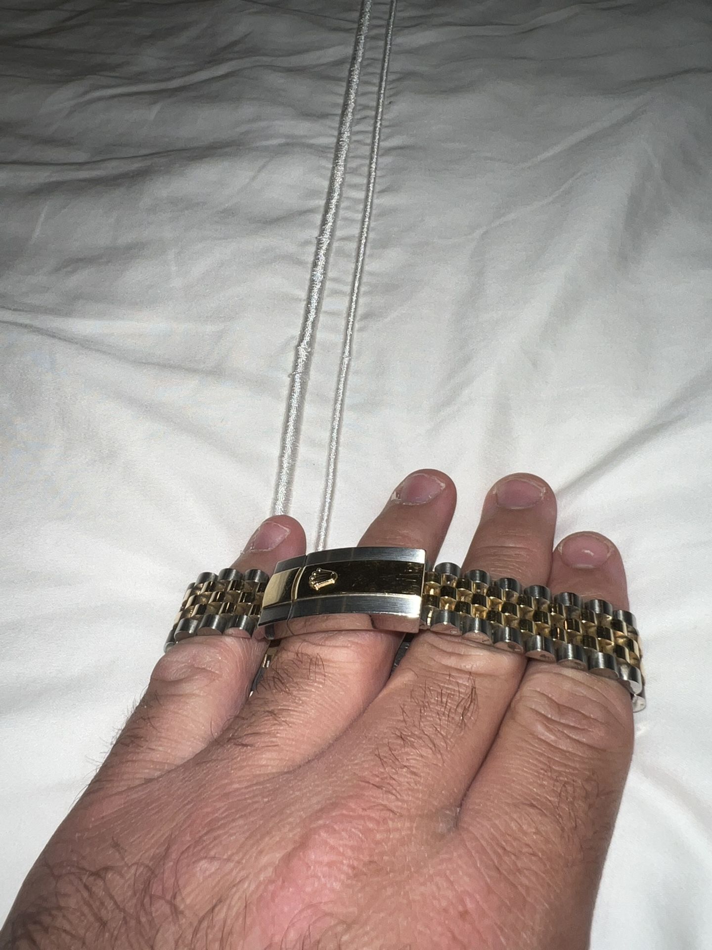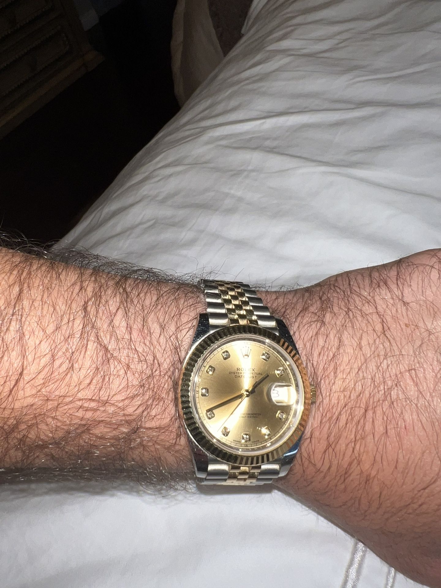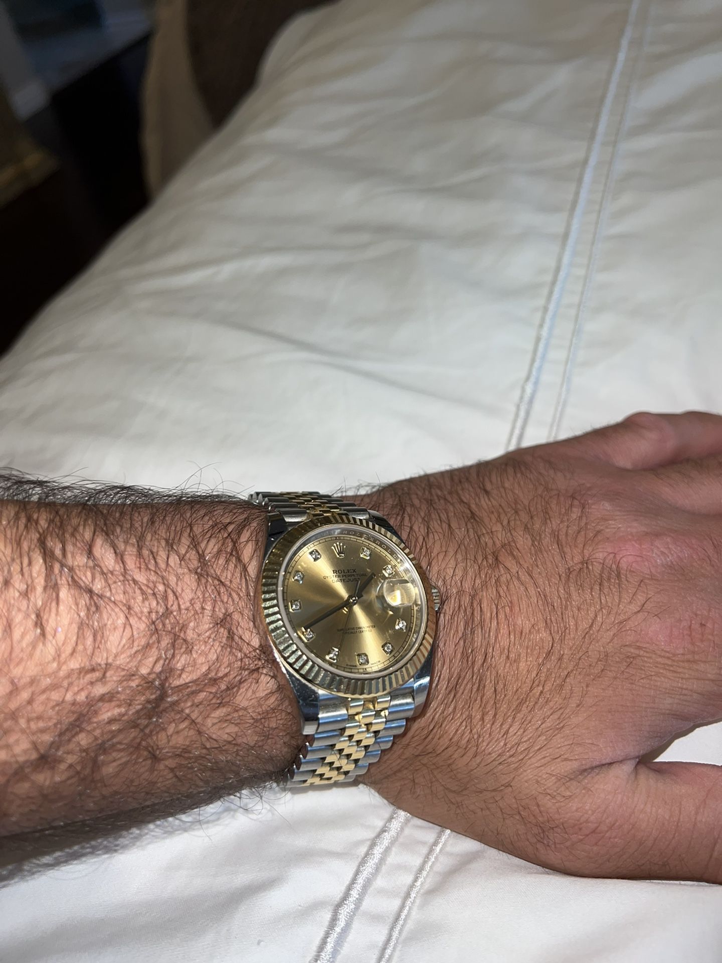 Men date just 40mm champagne dial jubilee band two tone with Diamond dial. Completely authentic from Rolex. Comes with box and papers. Barely worn. Serious inquires only. No shipping.