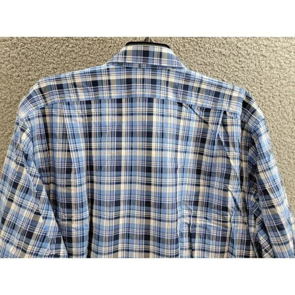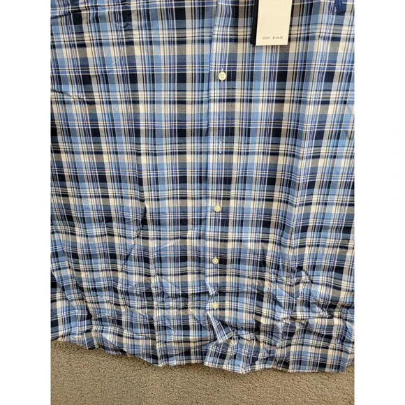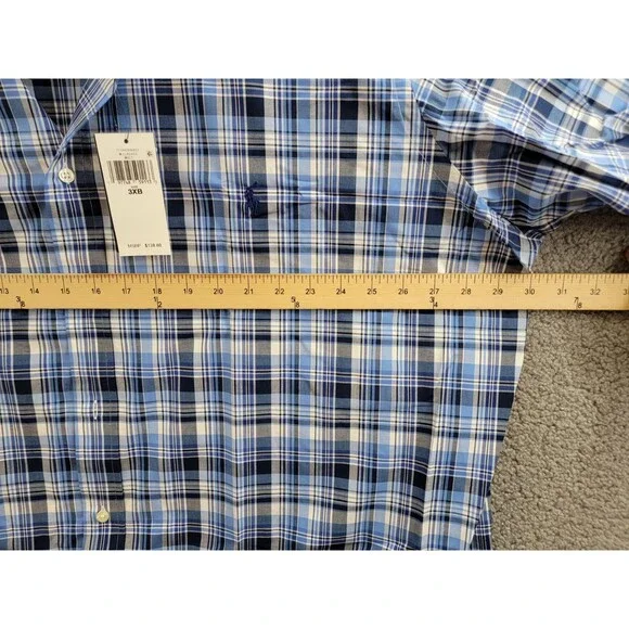Polo Ralph Lauren Big Tall Plaid Stretch Poplin Shirt Men´s 3XB Blue MultiPolo Ralph Lauren Big Tall Plaid Stretch Poplin Shirt Men´s 3XB Blue MultiRetail $138.00 The Polo Ralph Lauren Men´s Big Tall Plaid Stretch Poplin Shirt in Blue Multi is a stylish and comfortable button-down shirt perfect for casual occasions. Made from a blend of cotton and elastane, this shirt features a collared neckline, long sleeves, and a spread collar style. With a regular fit and a chest size of 60 inches, this breathable shirt is ideal for the summer, fall, and spring seasons. The classic blue multi plaid pattern adds a touch of style to this timeless wardrobe staple from Polo Ralph Lauren.* Medium-spread collar* Buttoned placket* Long sleeves with buttoned barrel cuffs* Split back yoke with a box pleat ensures a comfortable fit and a greater range of motion* Signature embroidered Pony at the left chest* Cotton, elastane* Machine wash* ImportedFAST SHIPPING QUALITY GUARANTEE!Quality Assurance:* Every item is carefully inspected and sealed after photography to ensure excellent condition upon arrival.* We strive for accuracy, but please review all photos thoroughly to confirm item details.Measurements:* See photos for detailed measurements and additional item specifics.* Measurements are approximate and provided to help ensure the best fit.* For pants, waist (one side), rise, and inseam measurements are clearly displayed.* Compare these measurements