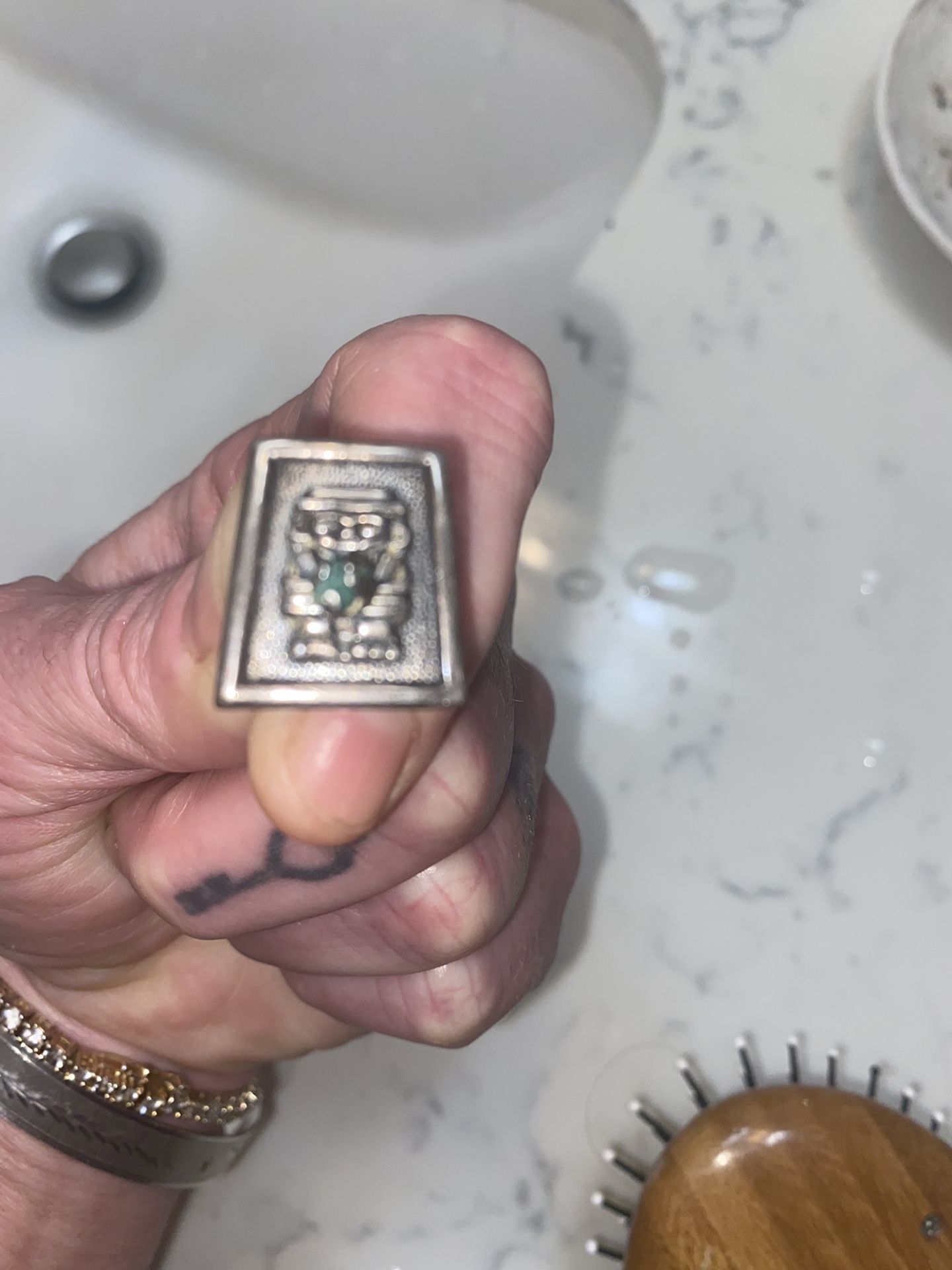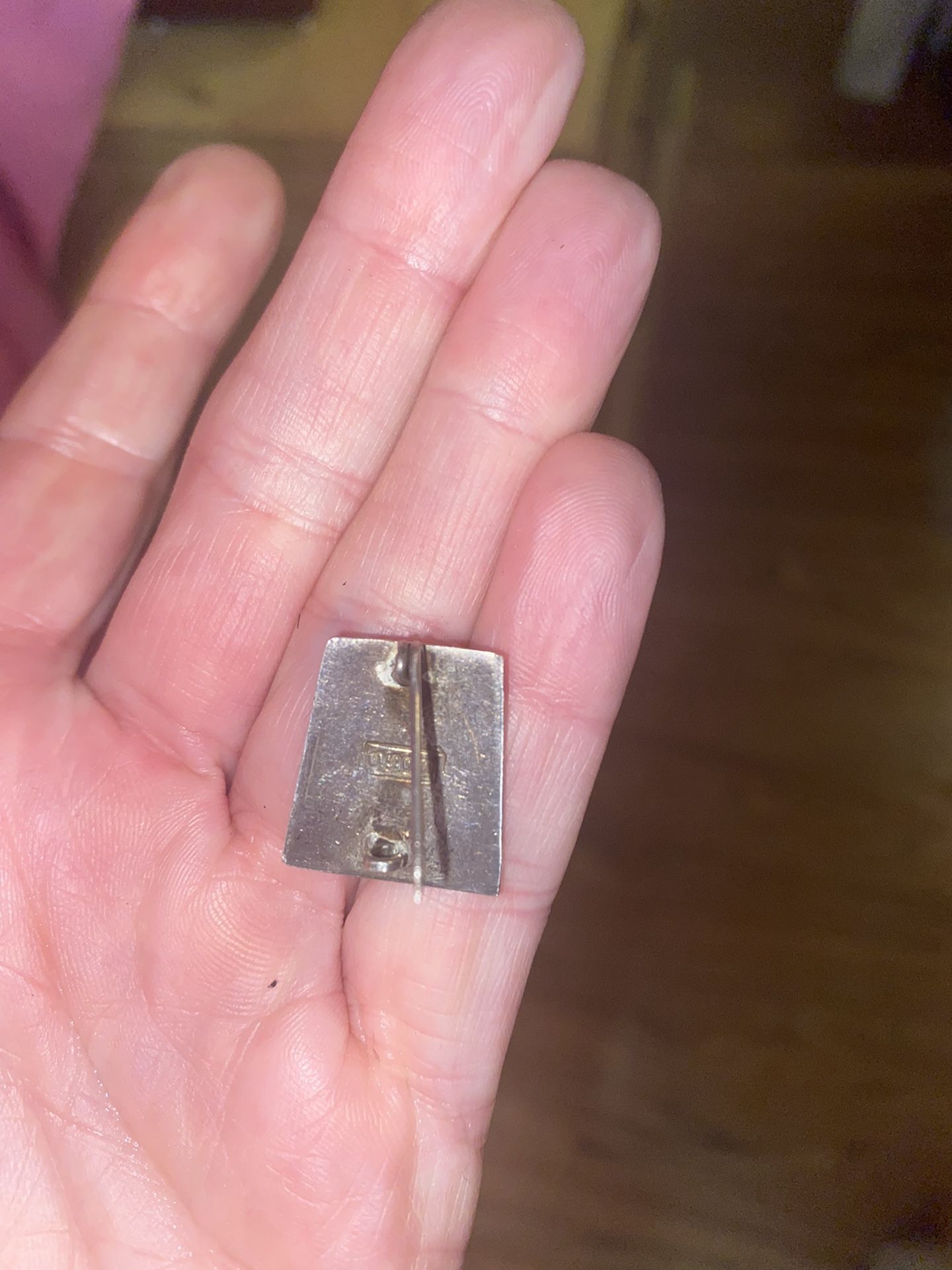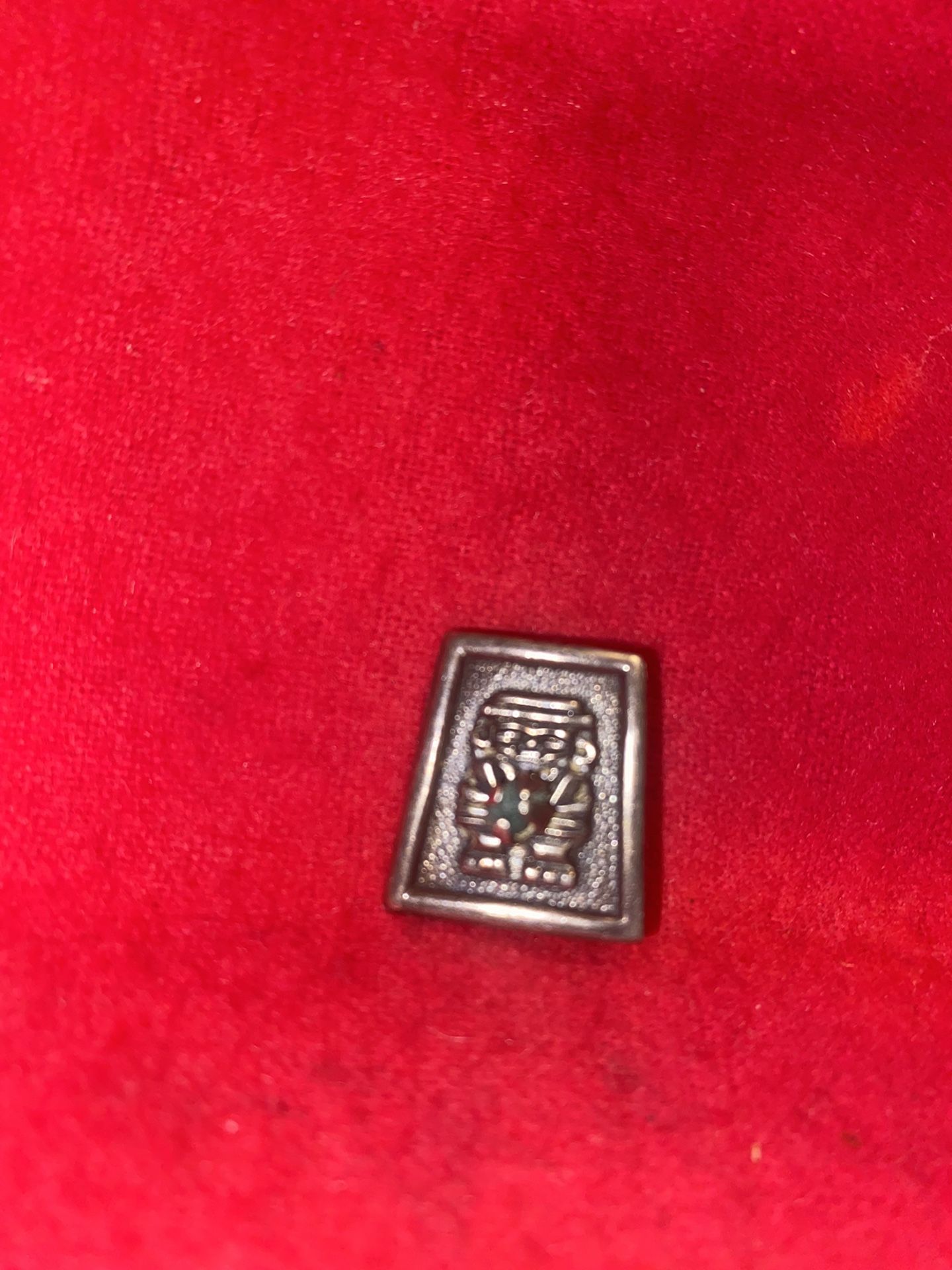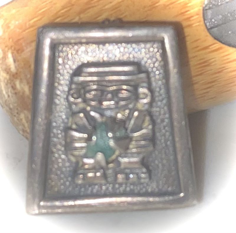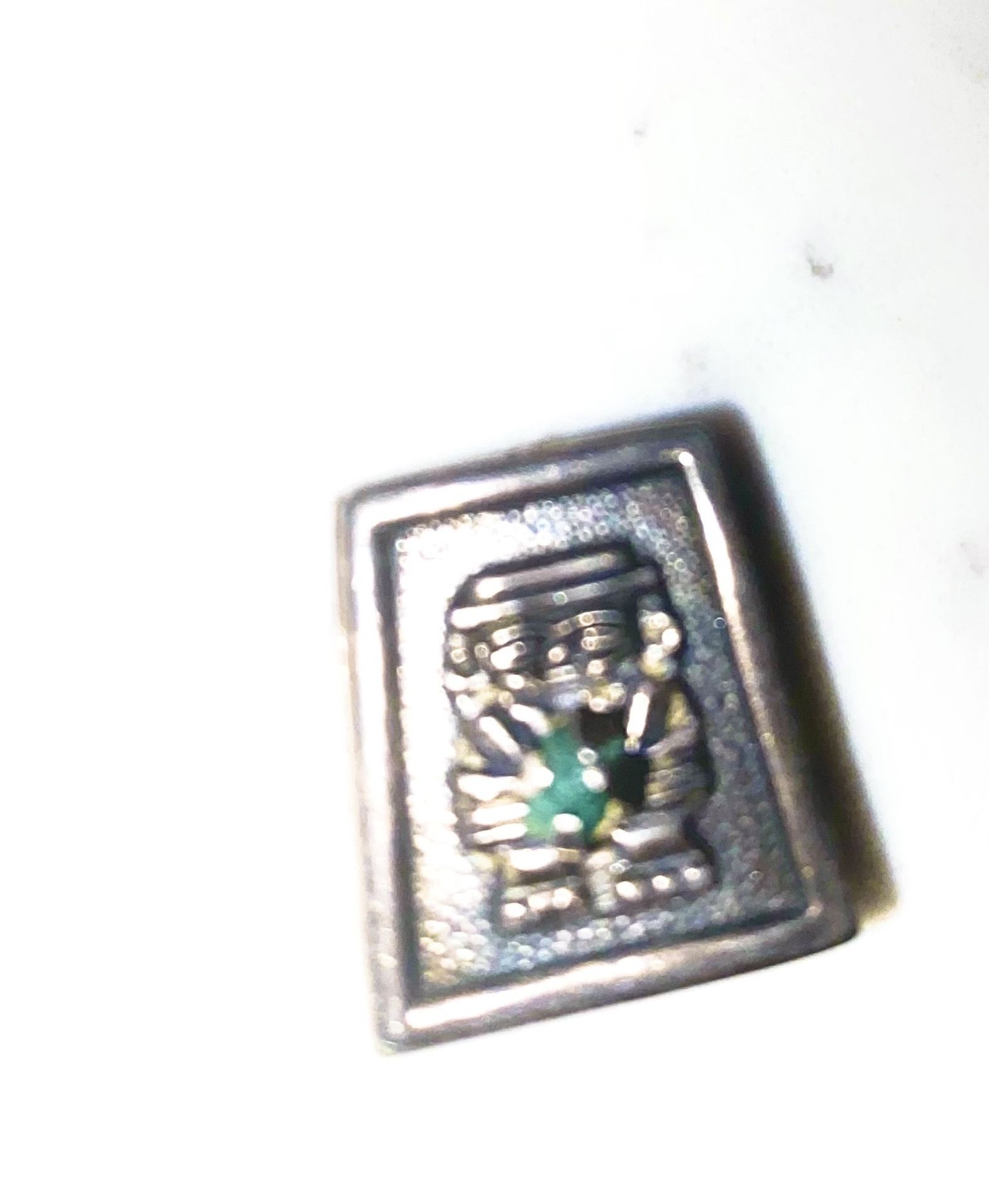 Colombian Silver pin broach. Inca God holding raw Emerald on 900 silver. May be older and part of more elaborate costuming prior to 1940’s /1930’s now a pin @1” tall .5”wide. Strong clasping pin