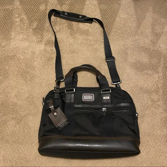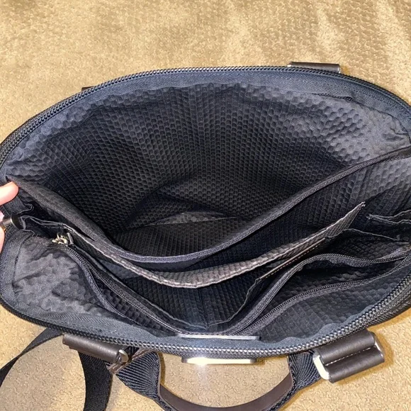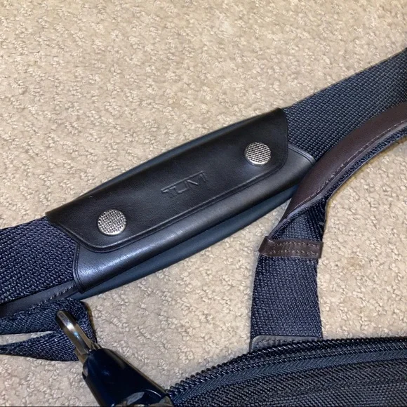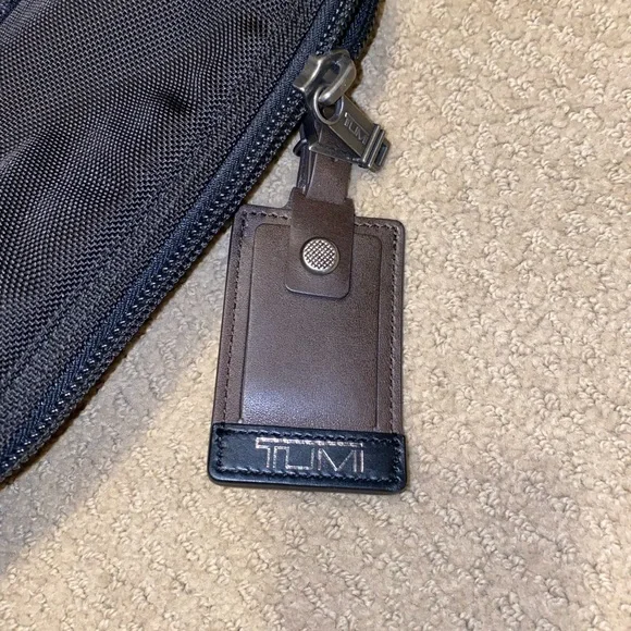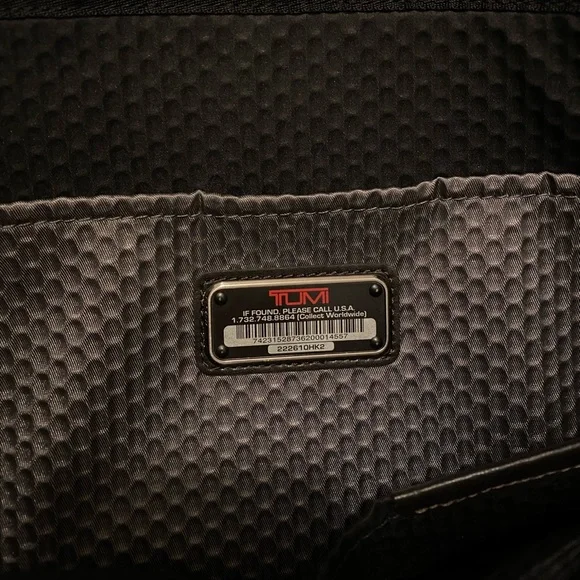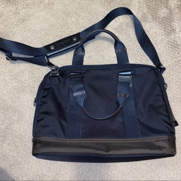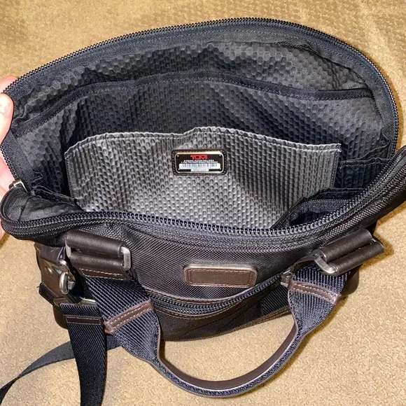 Leather and canvas Tumi bag. Laptop sleeve and other pockets with zippers. Everything is in great condition. Inside is very clean no tearing or staining.