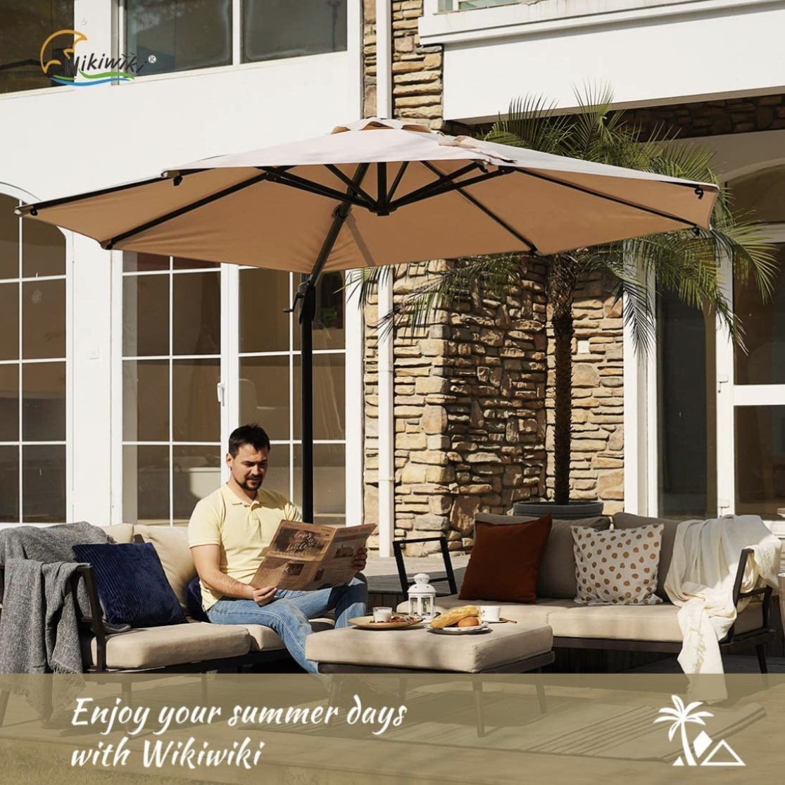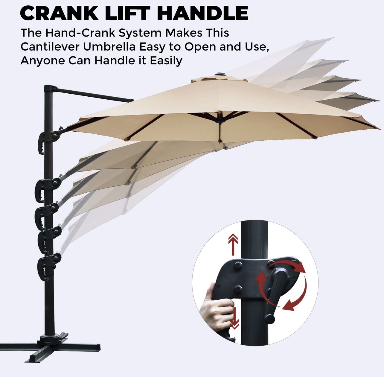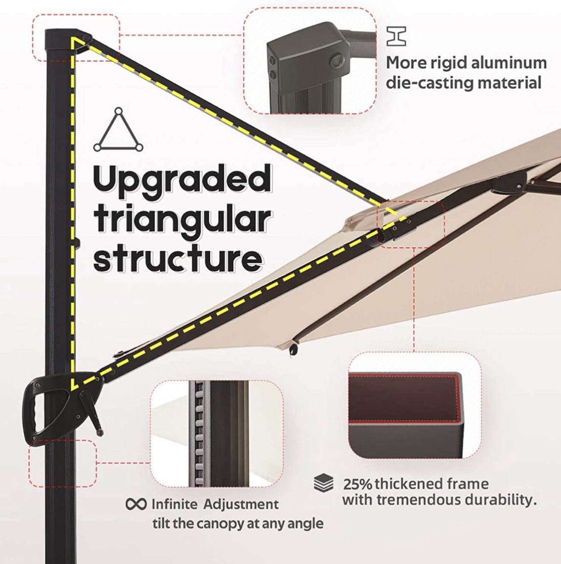 UPGRADED CANOPY: The WIKIWIKI M Series umbrella has a PU coated canopy is made of 280 gsm solution dyed fabric with US standard grade 5 protection from light. The thick material provided excellent UV resistance and is waterproof up to 800 pa´s of pressure. We proudly offer a 3-year canopy warranty. ROBUST & STABLE: The cantilever umbrella uses a triangular structure to provide support to the whole umbrella, which helps to reduce swaying and rocking of the canopy. For the 2022 version, we have improved the joint on the top triangular structure into aluminum die cast. Aluminum is light but sturdy, which makes it the perfect material for stability. ROTATION & TILTING: The cantilever umbrella can be rotated 360° horizontally by simply stepping on the pedal and twisting the pole. In addition, the infinite adjustable tilt mechanism can change the angle of the canopy and adjust the shading area to provide maximum shade all day. INNOVATIVE DESIGN: Our 2022 design doesn’t just stop with functionality. We added a light socket to the center hub of the umbrella for extra light and ambiance. We also added Velcro straps to the end of each rib so you can install string lights, wind chimes or other décor that will make your outdoor area feel like home.