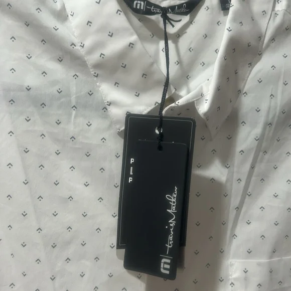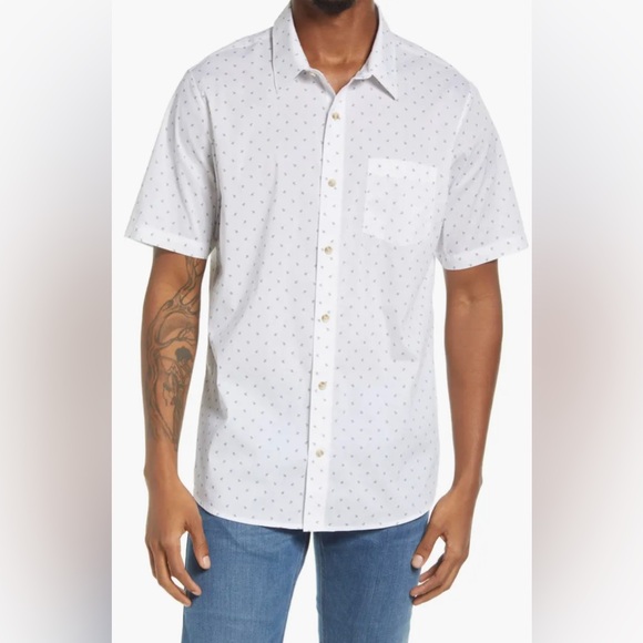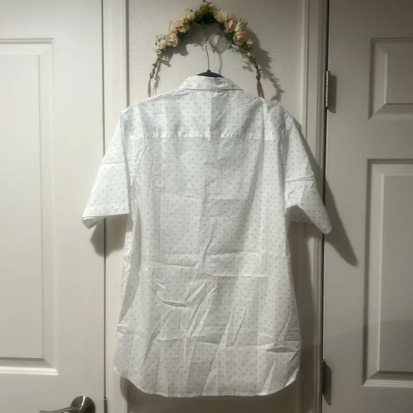 Elevate your style with this classic white short sleeve shirt. Perfect for any occasion, it offers comfort and a timeless look.* A touch of stretch adds extreme comfort to this lightweight button down! * NWT!!* Color is white with arrow design.* Size - Large.