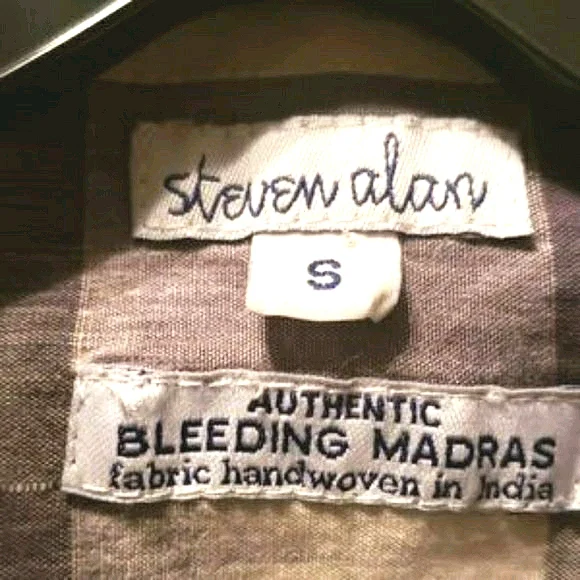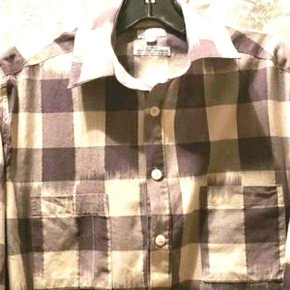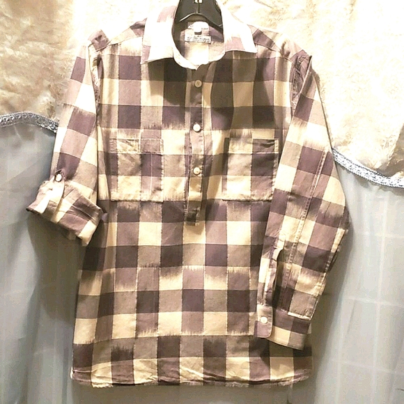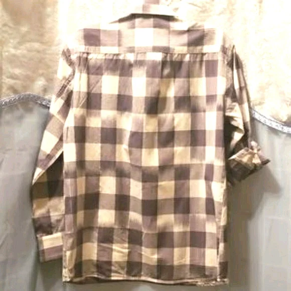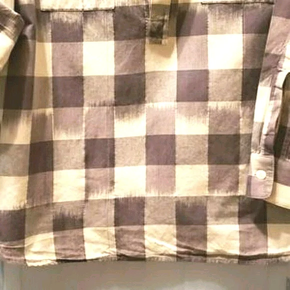MEN´S STEVEN ALAN GREY/WHITE PLAID SHIRT SZ S, previously worn,roll-up cuff straps, 2 pockets,straight hem, 2/2 button down, sleeve pleats, collar, yoke/tucks, ARMPIT TO ARMPIT: 20", CHEST: 40", WAIST: 41", ARMPIT TO HEM: 16 1/2", SLEEVE LGTH: 21 5/8",